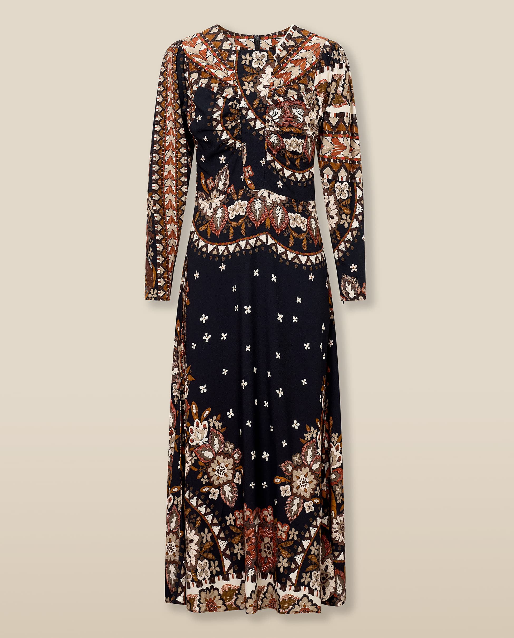 Una reinterpretación romántica de las influencias folk, el vestido Delphine presenta un intrincado estampado floral-paisley en cálidos tonos otoñales. Confeccionado en una silueta midi de caída suave, está detallado con delicados frunces en el busto, mangas largas y una falda fluida que se mueve con facilidad. Sutiles paneles en contraste realzan la cintura y los hombros para un acabado favorecedor.