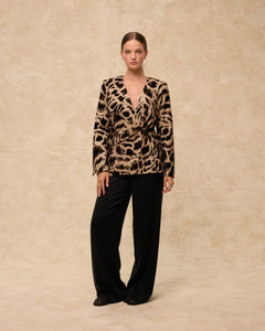Los pantalones Beduina están confeccionados en un lujoso jacquard italiano de acabado brillante con motivo de leopardo. Diseñados en una silueta ancha y relajada, cuentan con cintura elástica en la parte trasera para mayor comodidad y un frente limpio que aporta un acabado pulido. Combínalos con el blazer a juego para una propuesta sofisticada de noche.