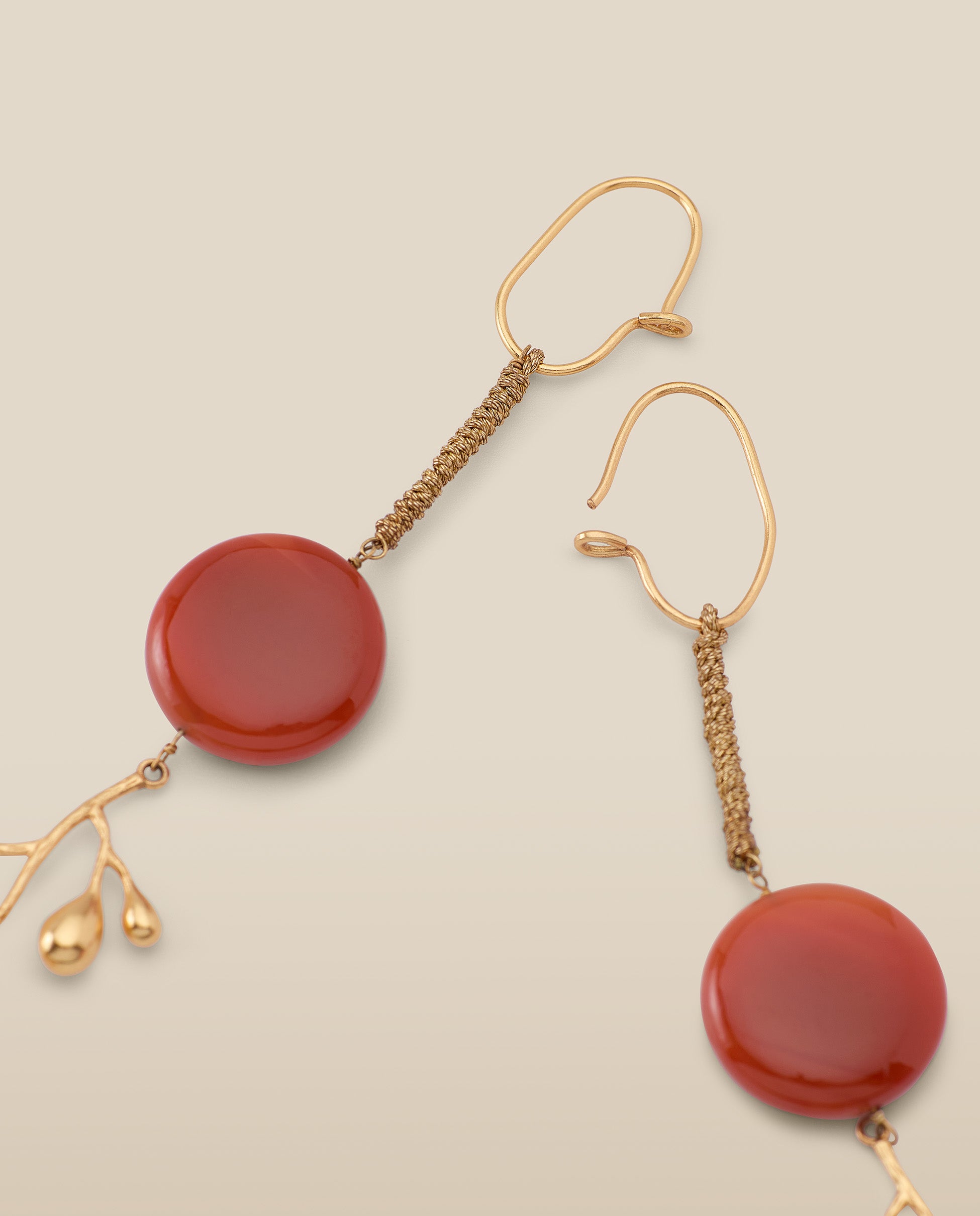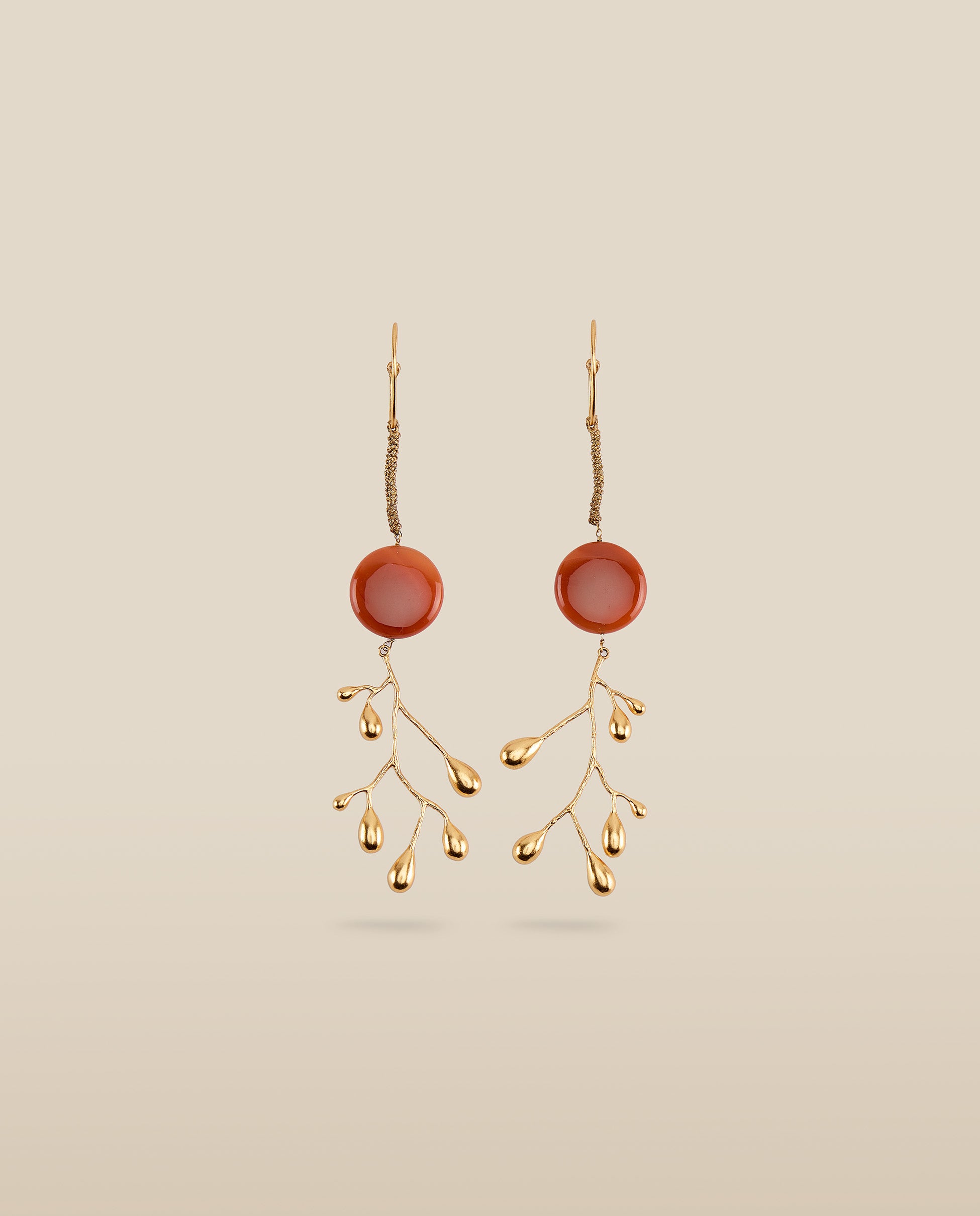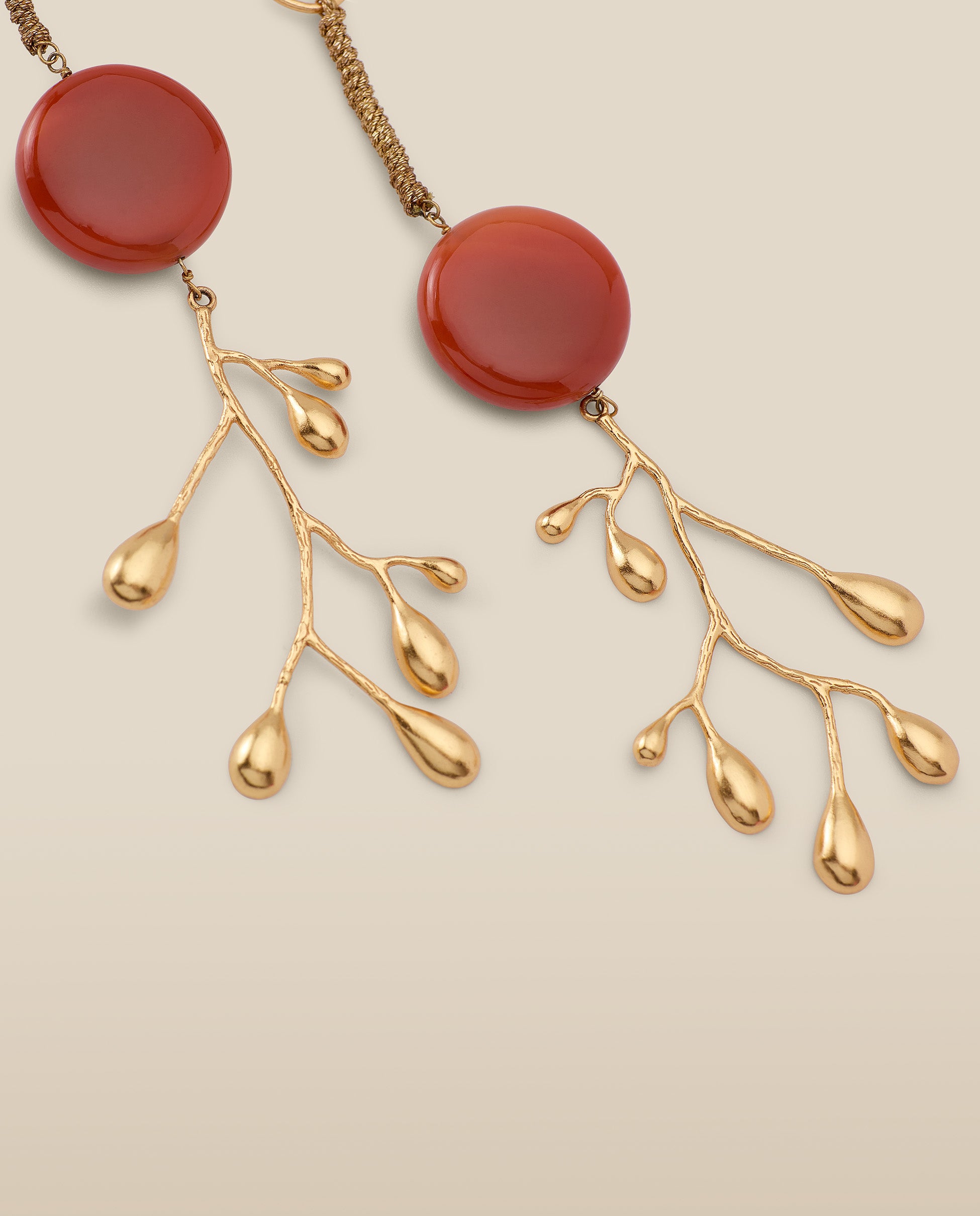 Inspirados en la naturaleza, los pendientes Brancheen combinan ramas esculturales con un toque de color. Confeccionados en metal chapado en oro de 22 quilates, cada pendiente cuenta con una Ágata Natural en forma circular de 2cm de diámetro.