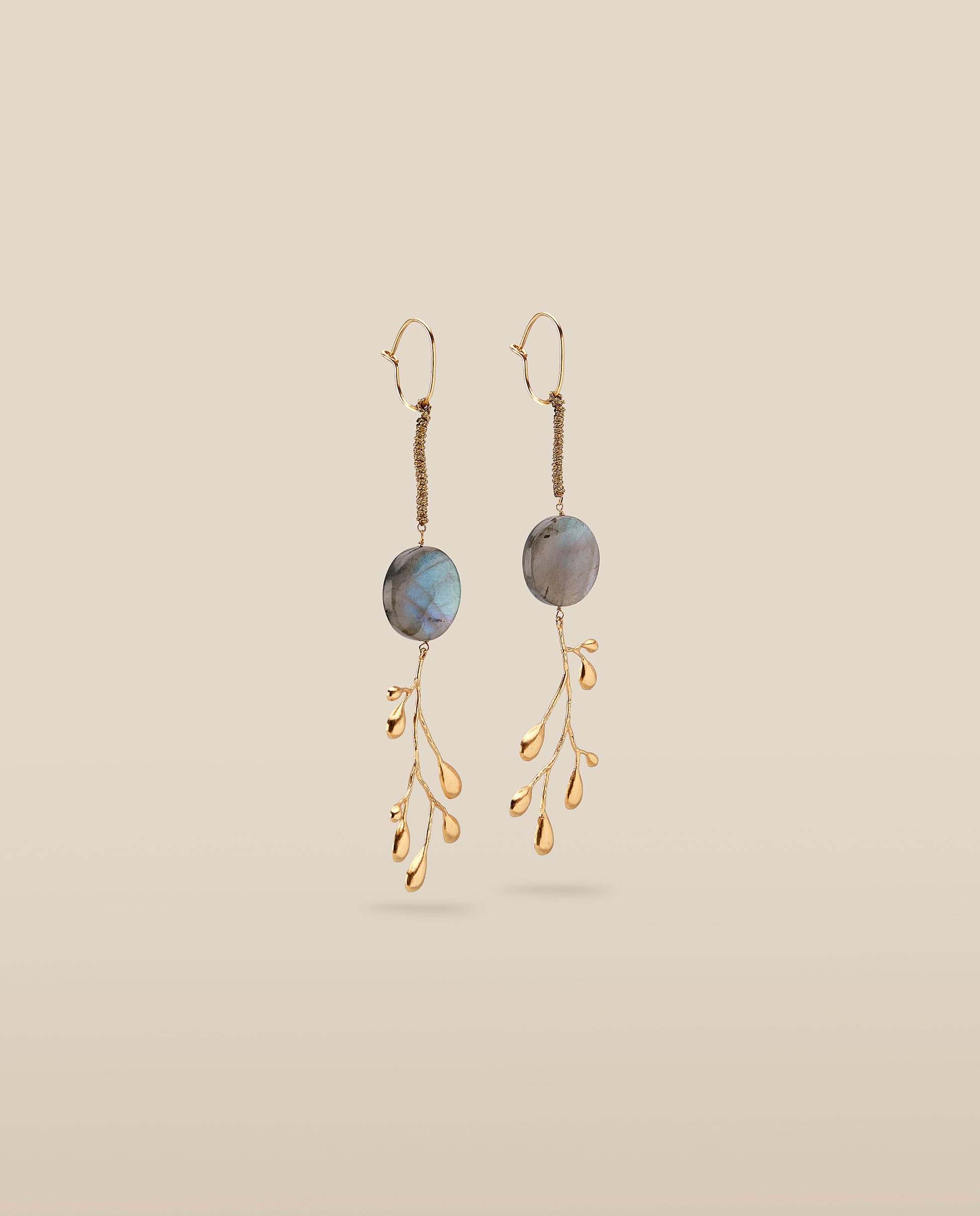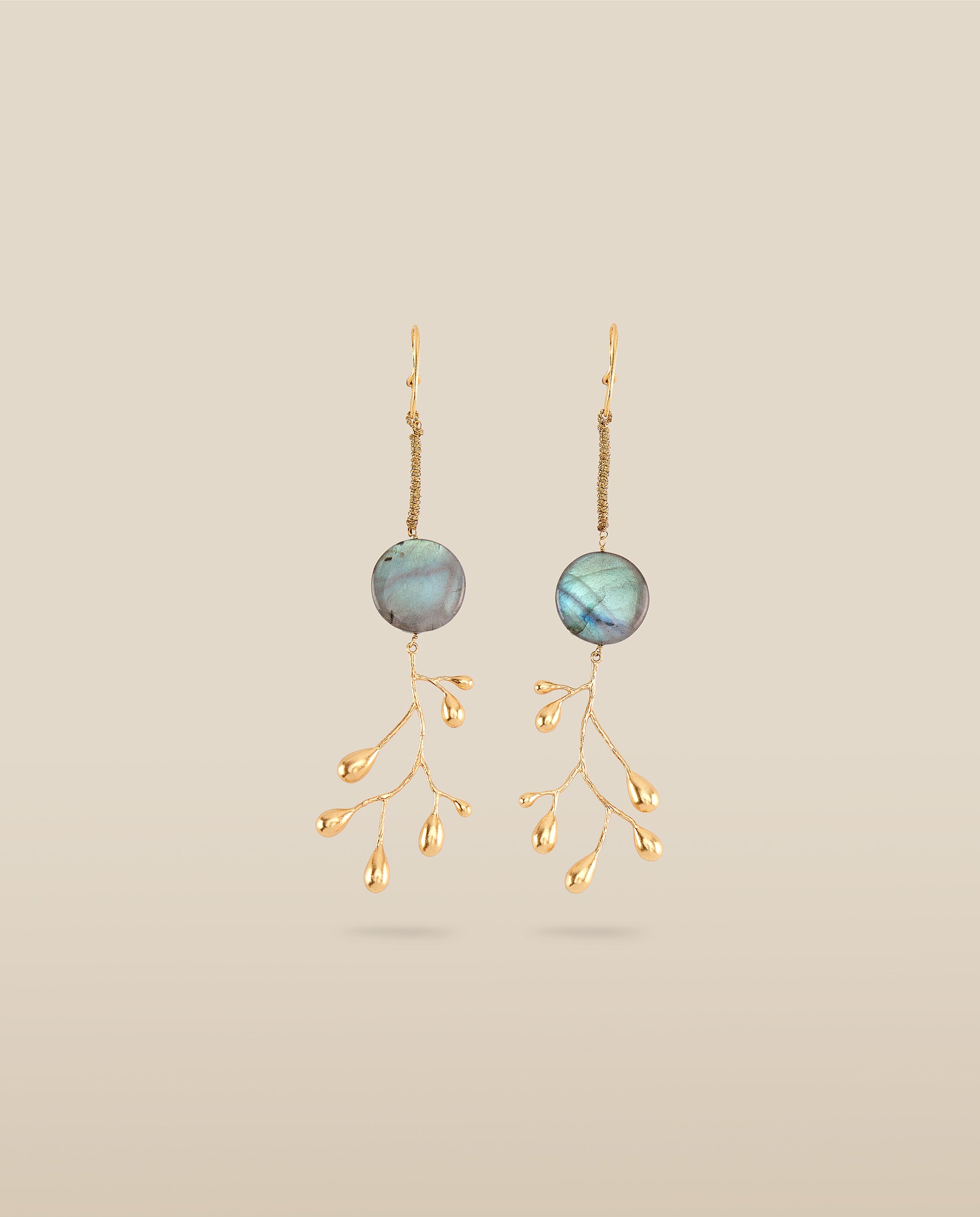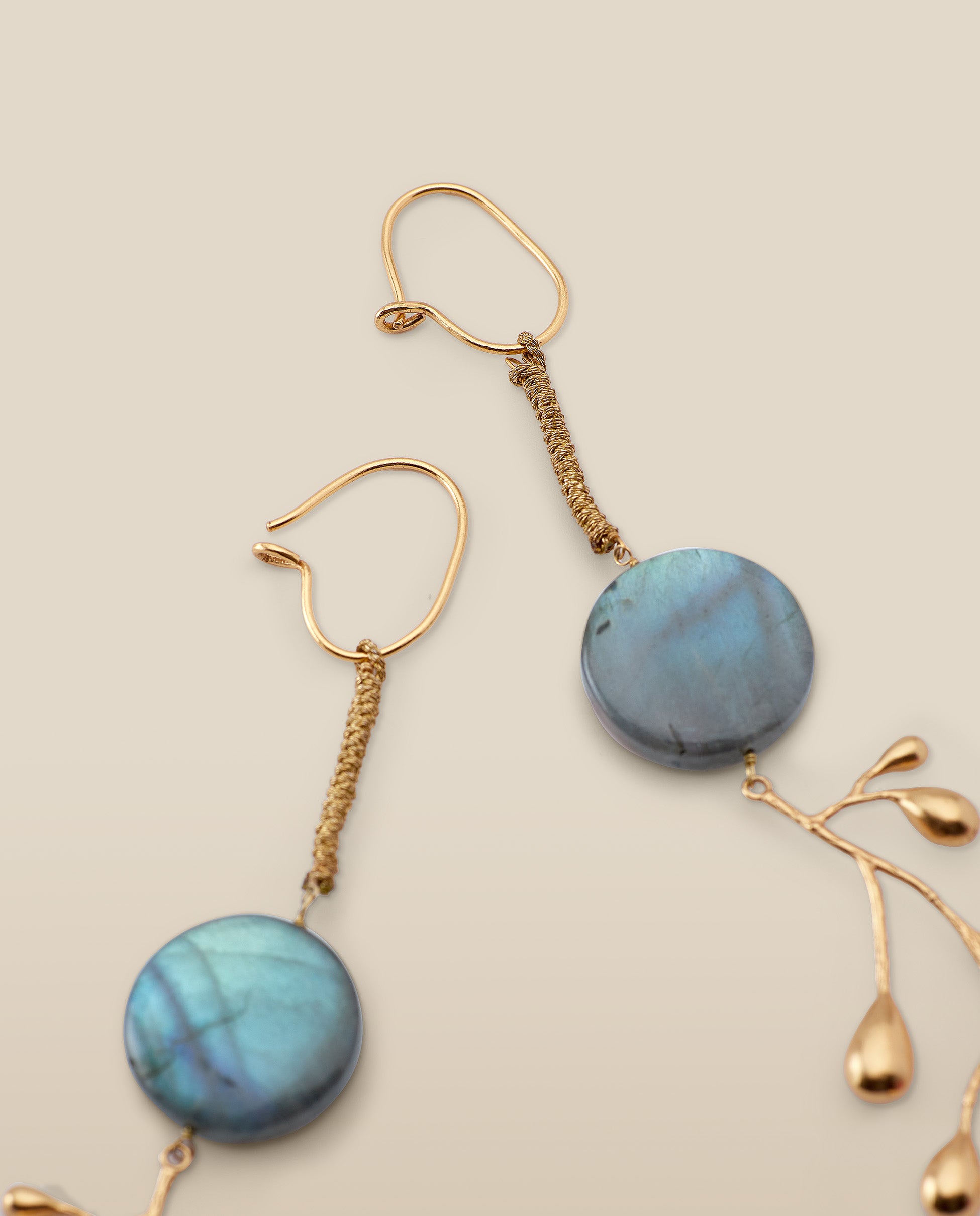 Inspirados en formas naturales, los pendientes Brancheen combinan siluetas orgánicas y movimiento fluido. Confeccionados en metal chapado en oro de 22 quilates, cada pendiente cuenta con una Labradorita en forma circular de 2cm de diámetro.