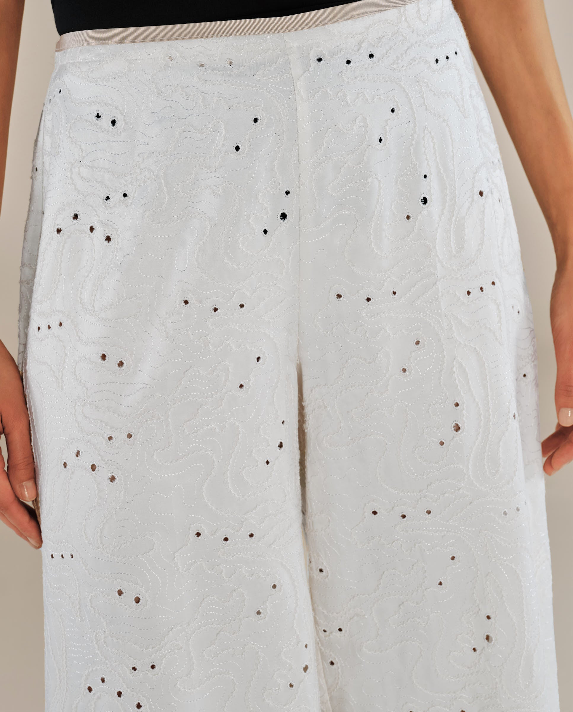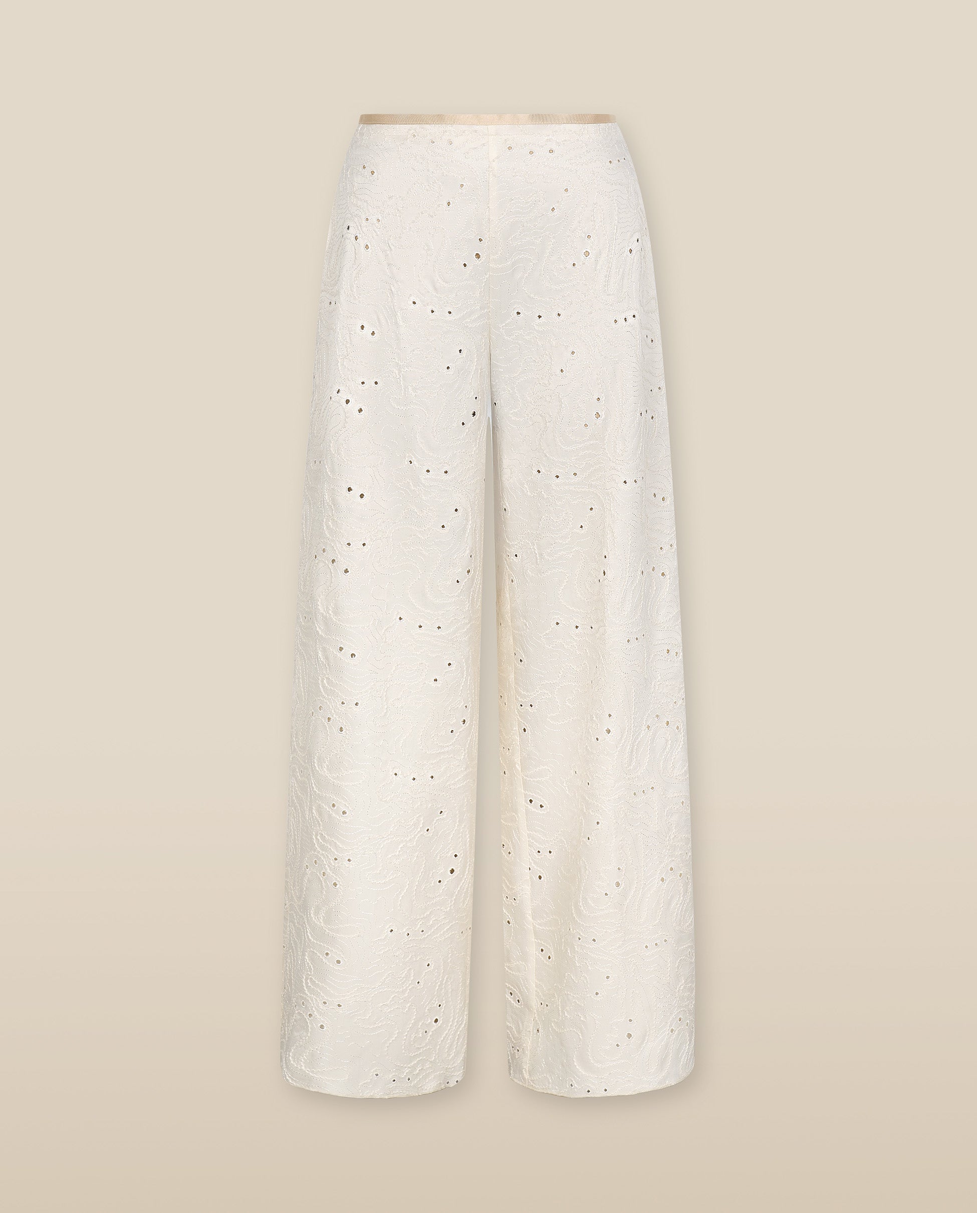Eleva tu vestuario con los pantalones Elodie en color crudo, confeccionados en un tejido ligero con una caída elegante y adornados con un bordado suelto en todo el diseño que aporta un acabado sofisticado y con textura. Diseñados con una cinturilla delantera de satén de tiro medio y una silueta de pierna ancha fluida, combinan comodidad con una sofisticación refinada. Combínalos con un top ajustado para un look pulido de día o con tacones para un estilo más elegante de noche.