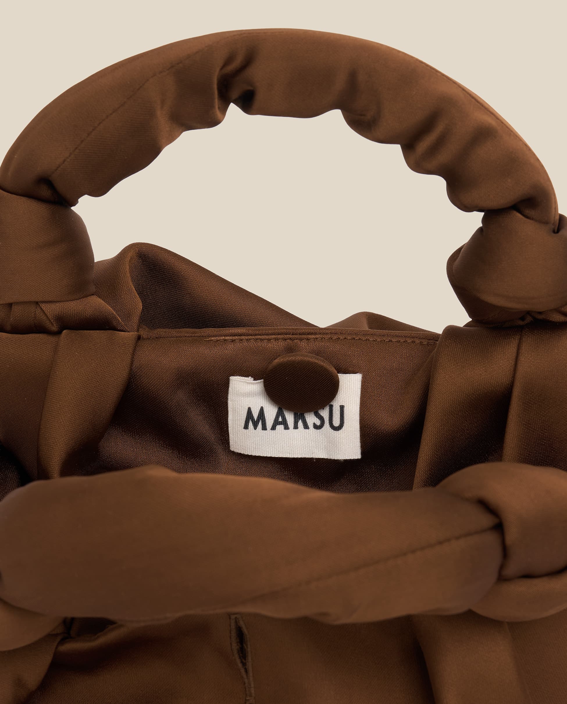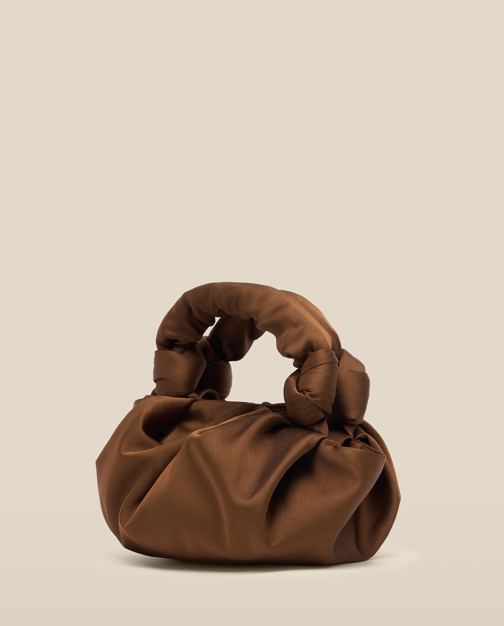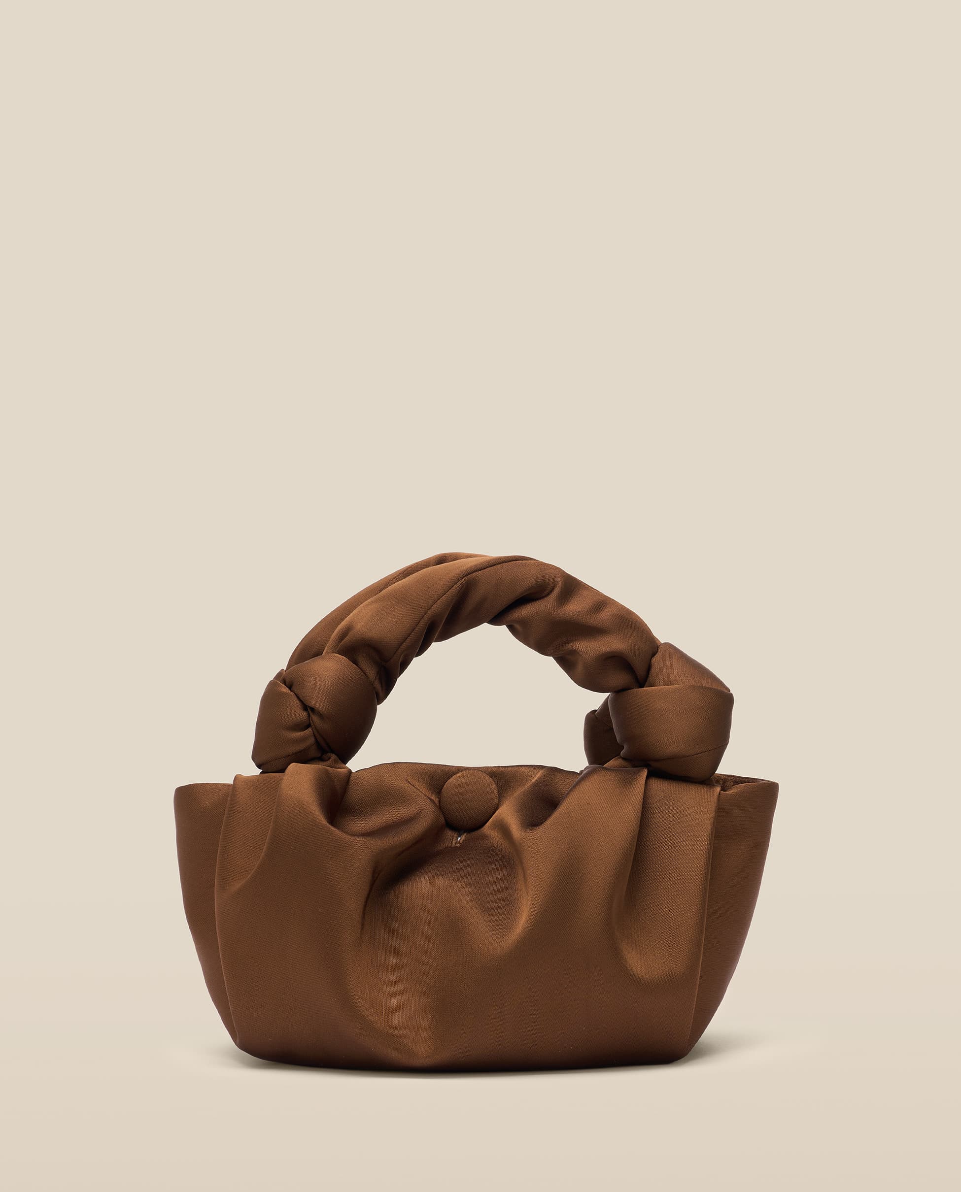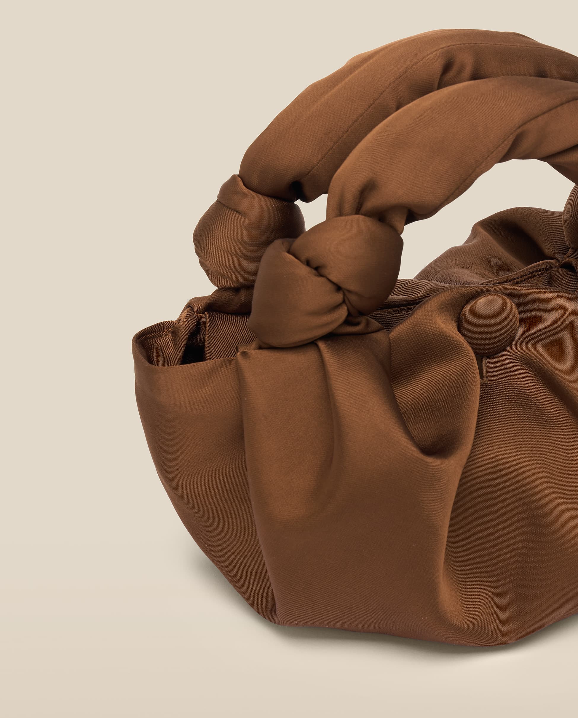 Confeccionado en satén con un sutil brillo, el bolso Gyosa destaca por su silueta acolchada y sus asas anudadas. Su forma se adapta de manera natural a la mano y cuenta con un botón forrado para mayor seguridad. Diseñado en un intenso tono naranja paprika para un efecto llamativo.
