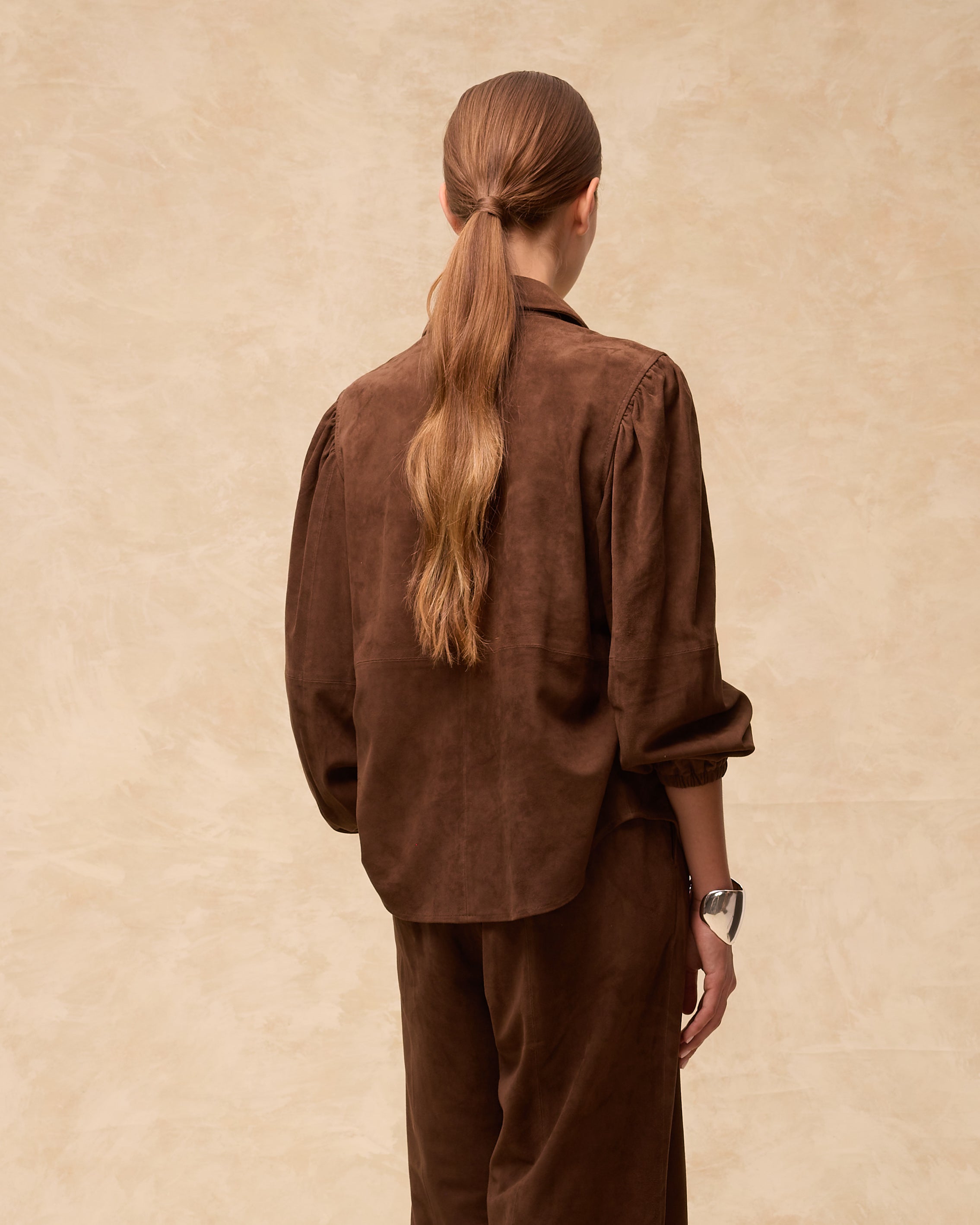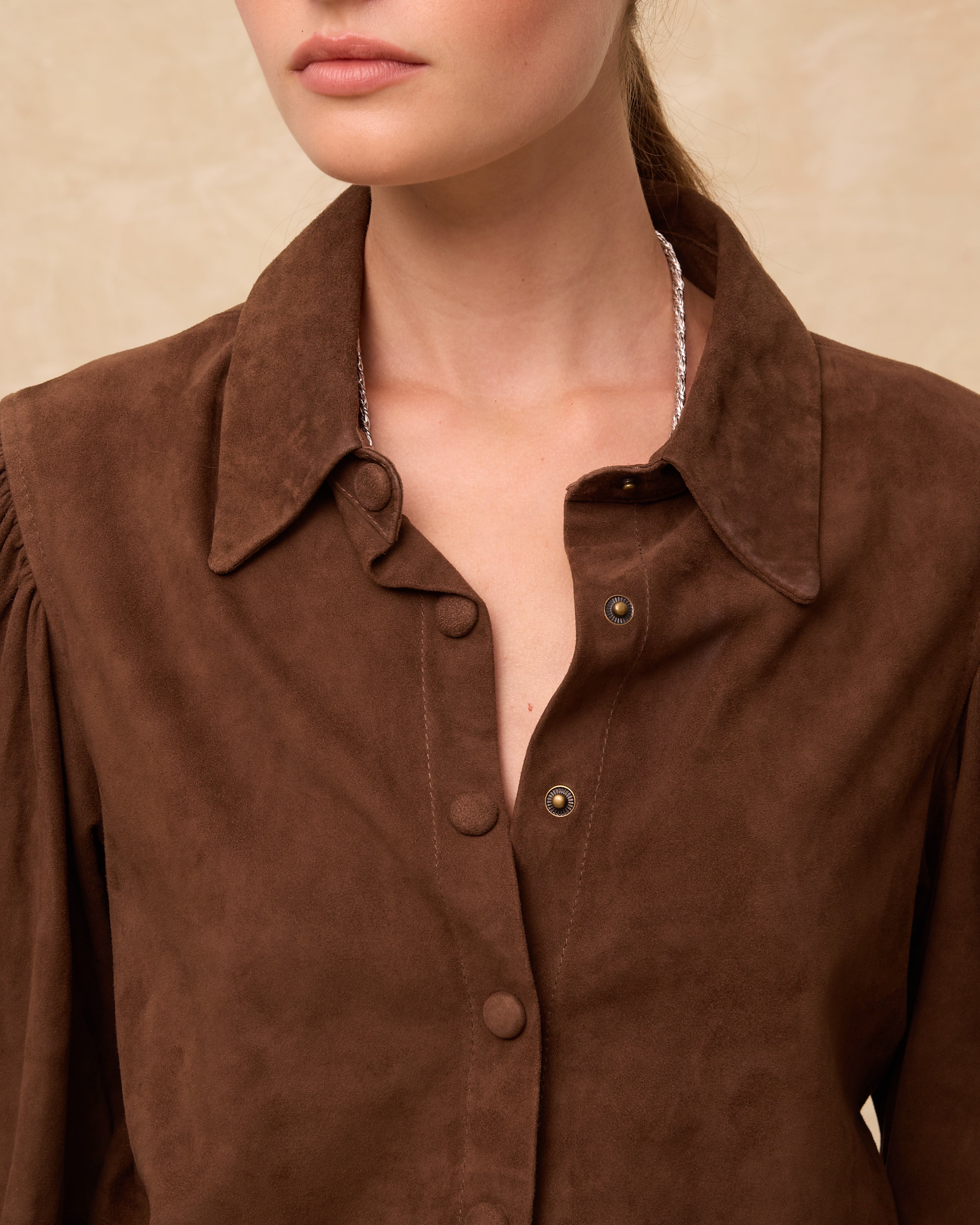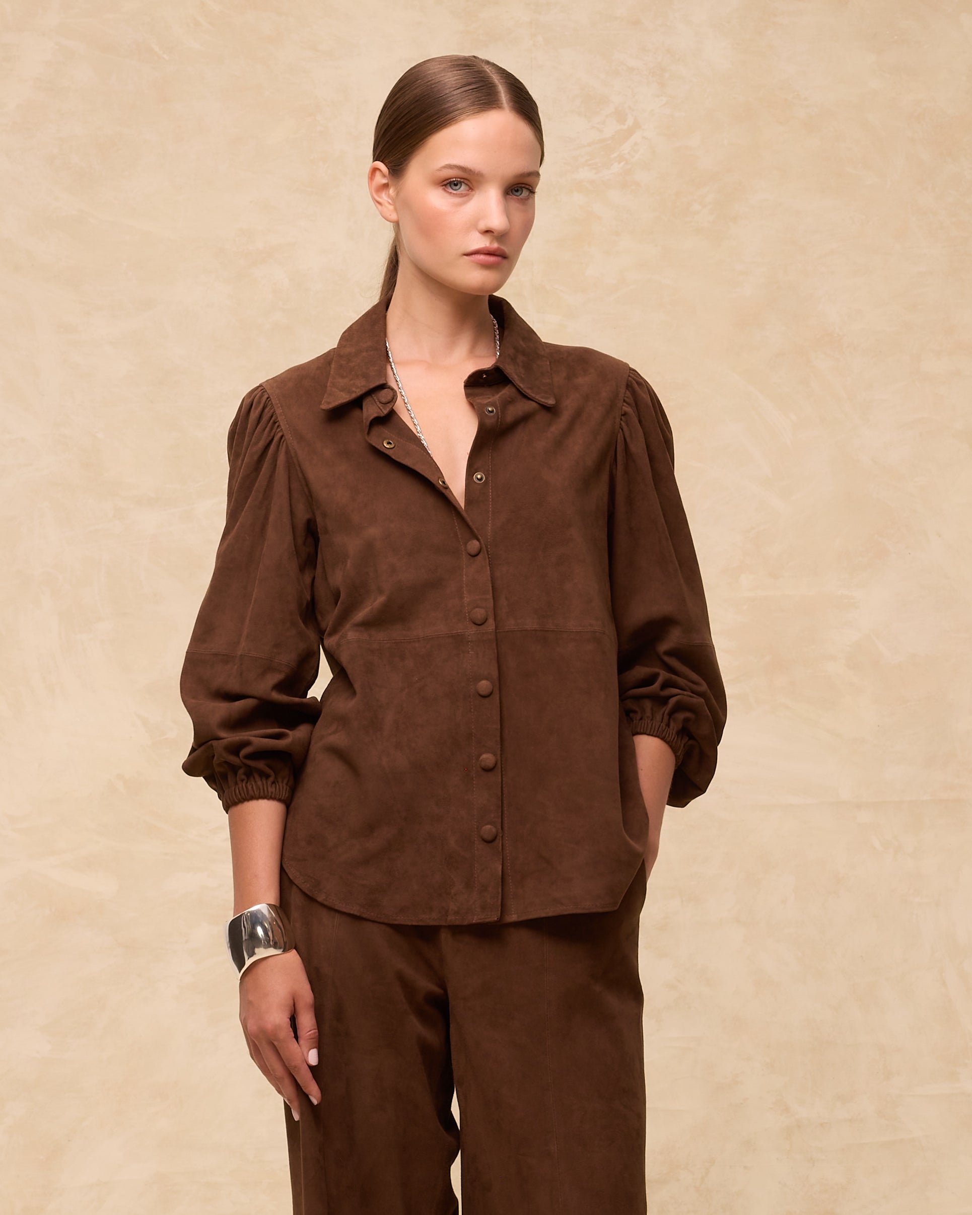 La blusa Mocha combina elegancia con una estructura relajada, confeccionada en ante de cabra 100% en un profundo tono marrón oscuro. Diseñada con una silueta suavemente entallada, presenta un clásico cuello camisero, cierres frontales de automáticos al tono y mangas ligeramente fruncidas con puños elásticos. El ante flexible cae con fluidez, aportando una sofisticación discreta tanto para el día como para la noche.