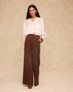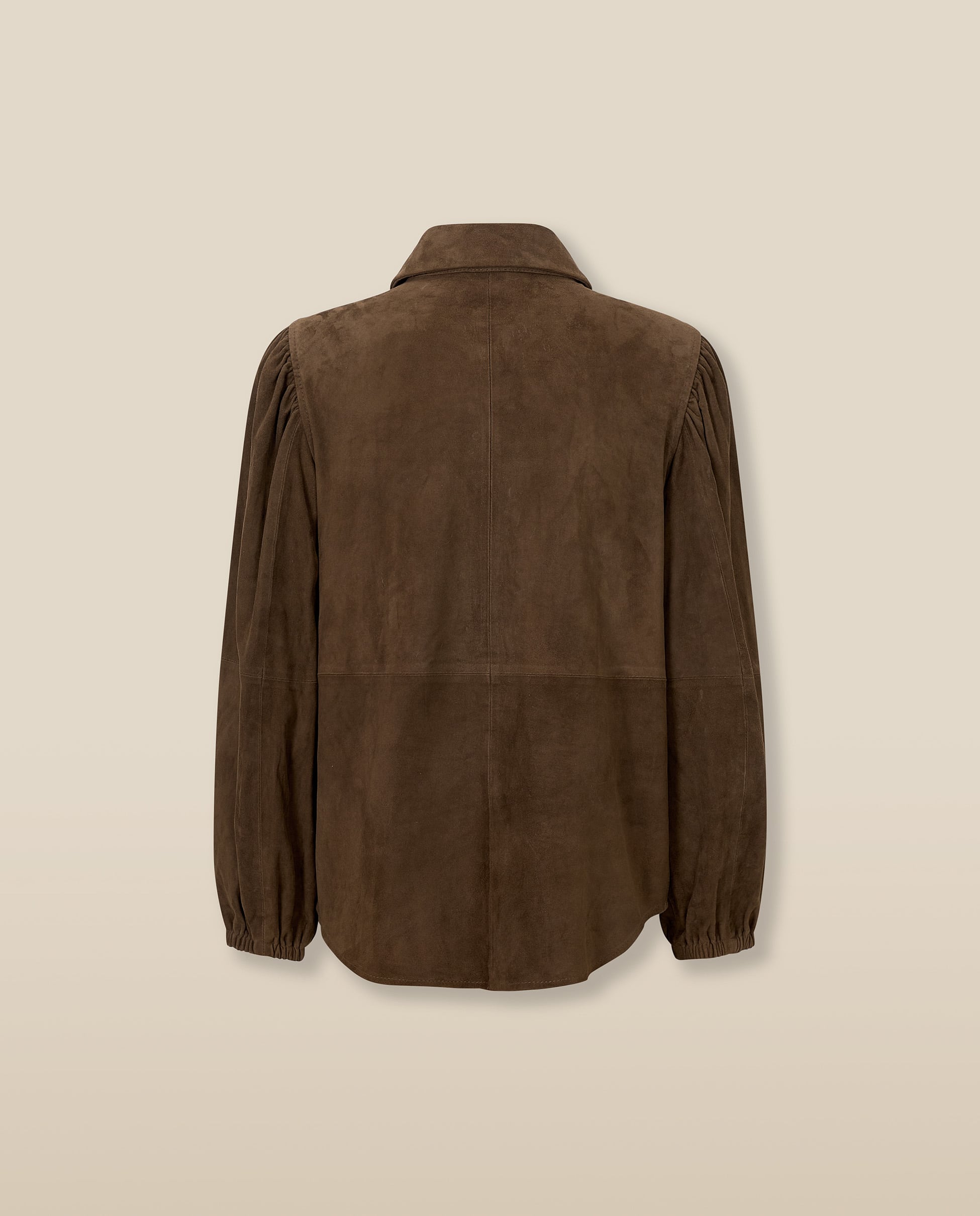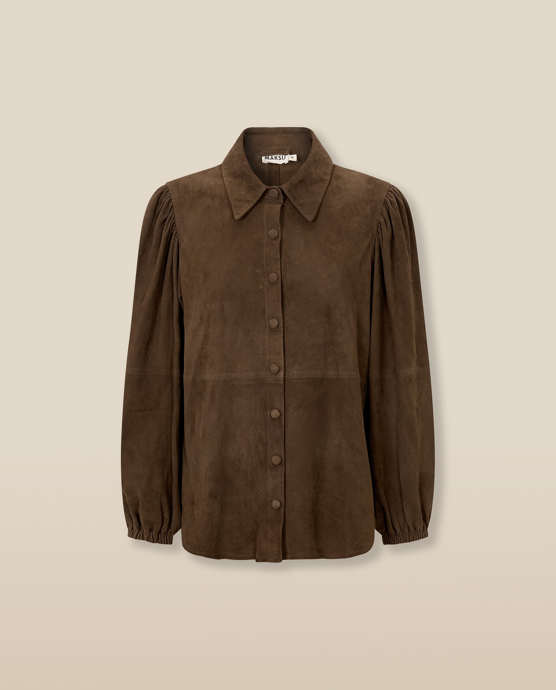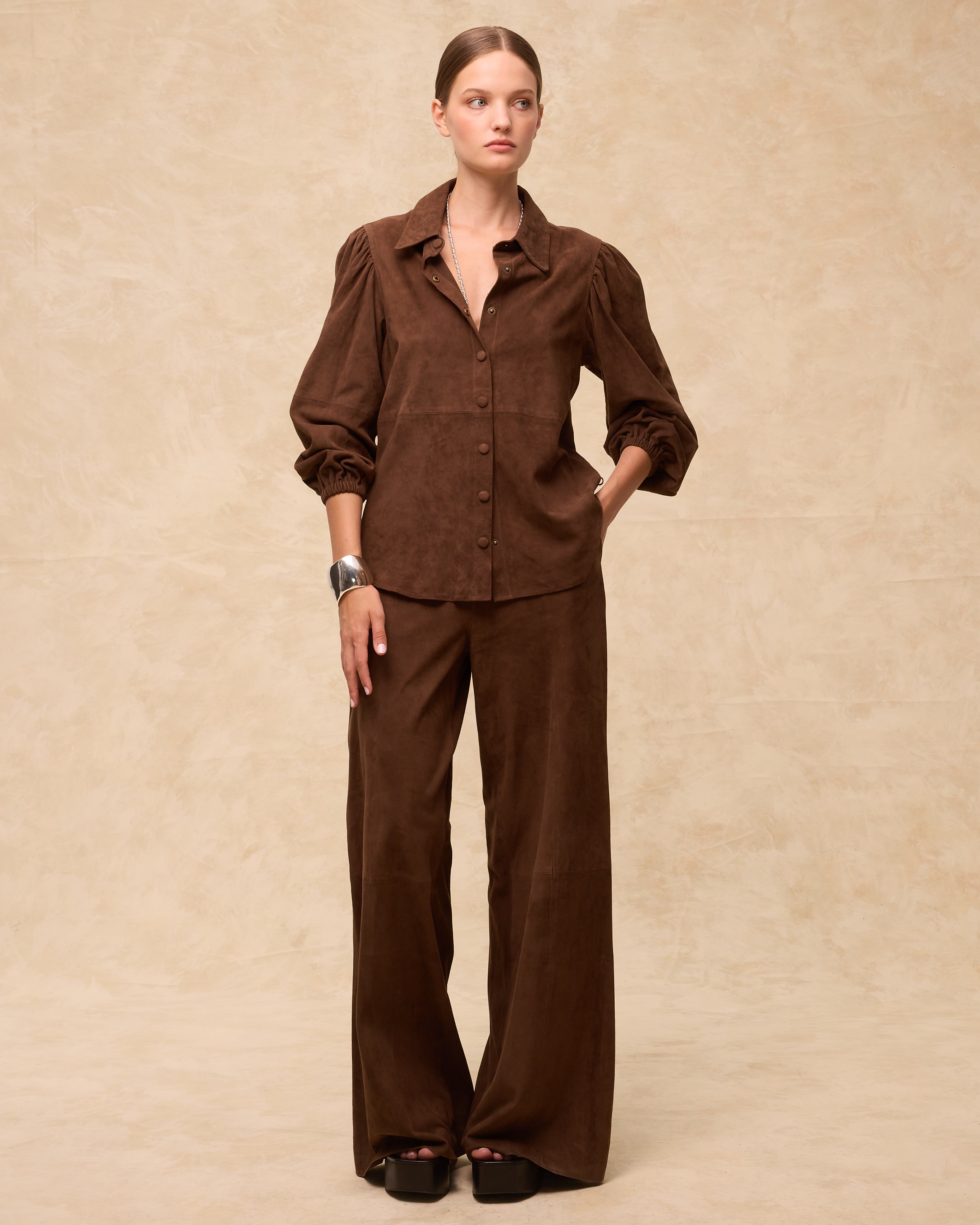 La blusa Mocha combina elegancia con una estructura relajada, confeccionada en ante de cabra 100% en un profundo tono marrón oscuro. Diseñada con una silueta suavemente entallada, presenta un clásico cuello camisero, cierres frontales de automáticos al tono y mangas ligeramente fruncidas con puños elásticos. El ante flexible cae con fluidez, aportando una sofisticación discreta tanto para el día como para la noche.