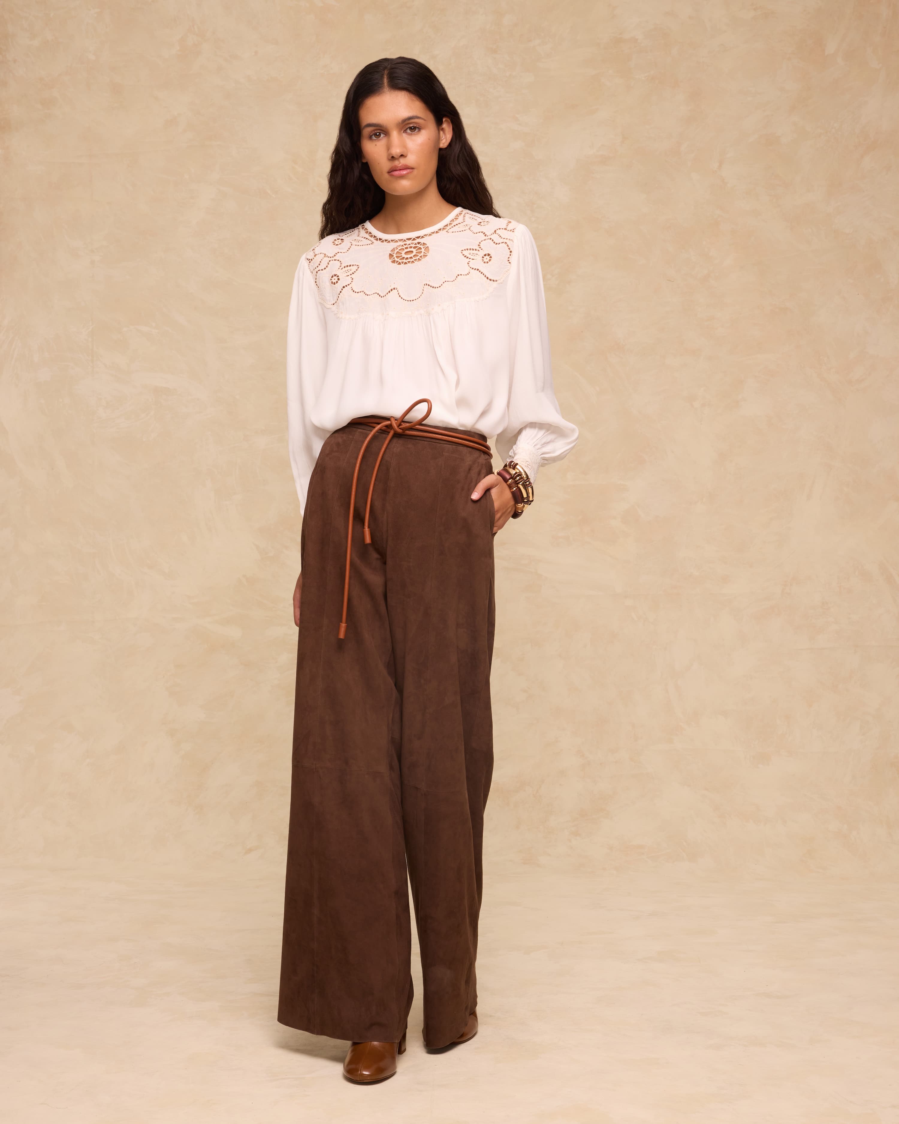 Confeccionados en ante de cabra 100%, los pantalones Mocha combinan suavidad y estructura en un intenso tono marrón profundo. Diseñados para llevarse a la cintura, presentan una cinturilla limpia, sutiles costuras frontales y una pierna ancha y generosa que aporta movimiento con elegancia. Los bolsillos laterales añaden funcionalidad, mientras que la silueta fluida los convierte en una prenda ideal para elevar looks de día a noche.