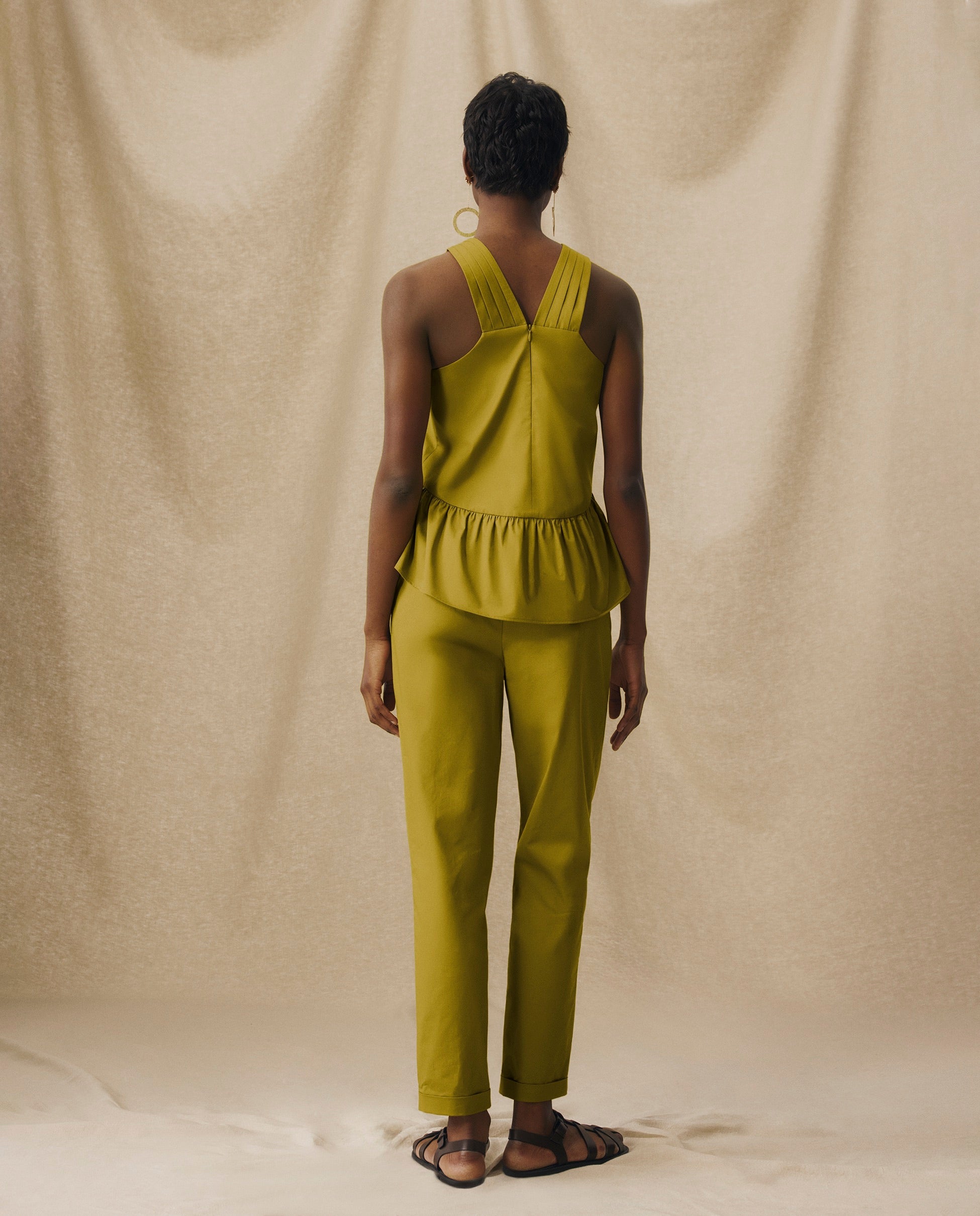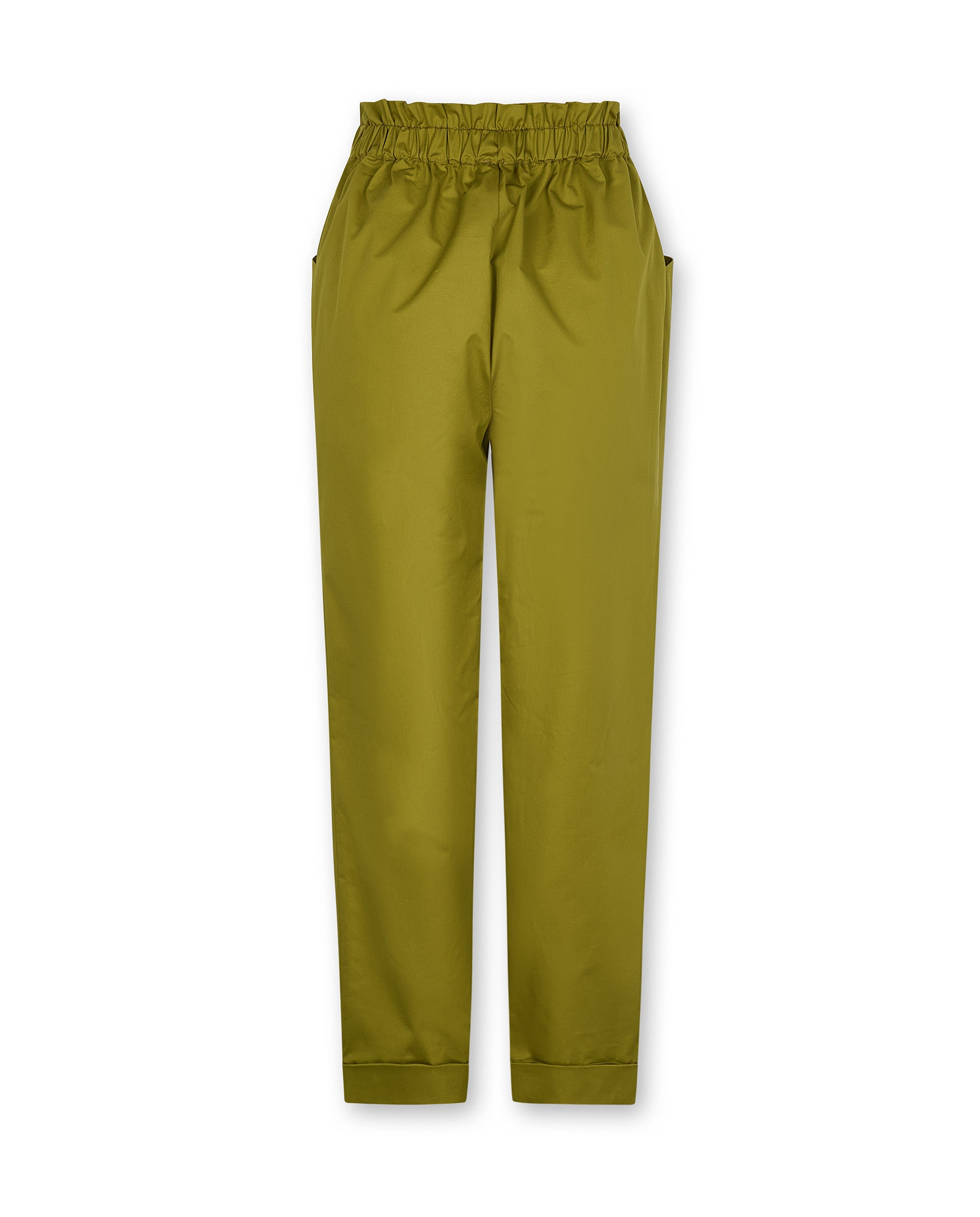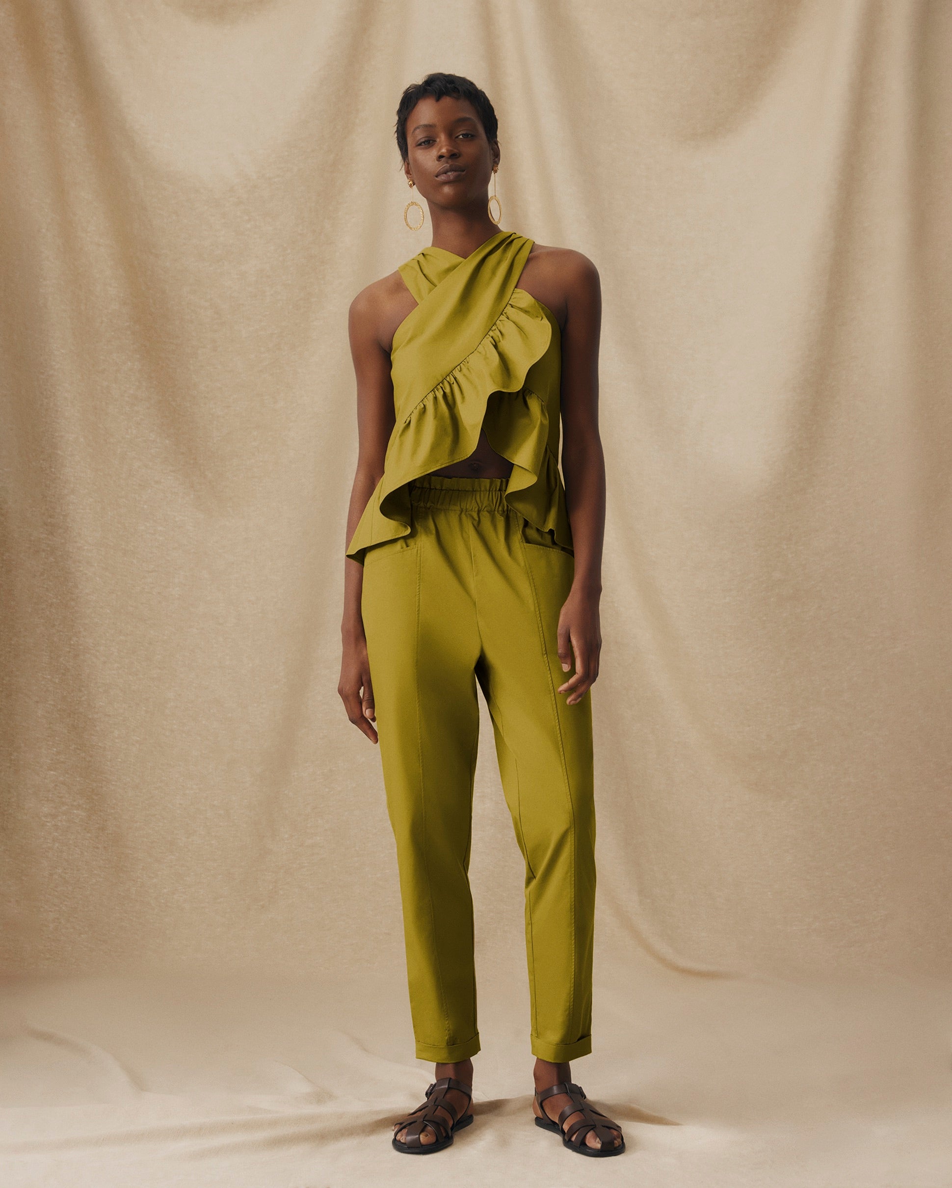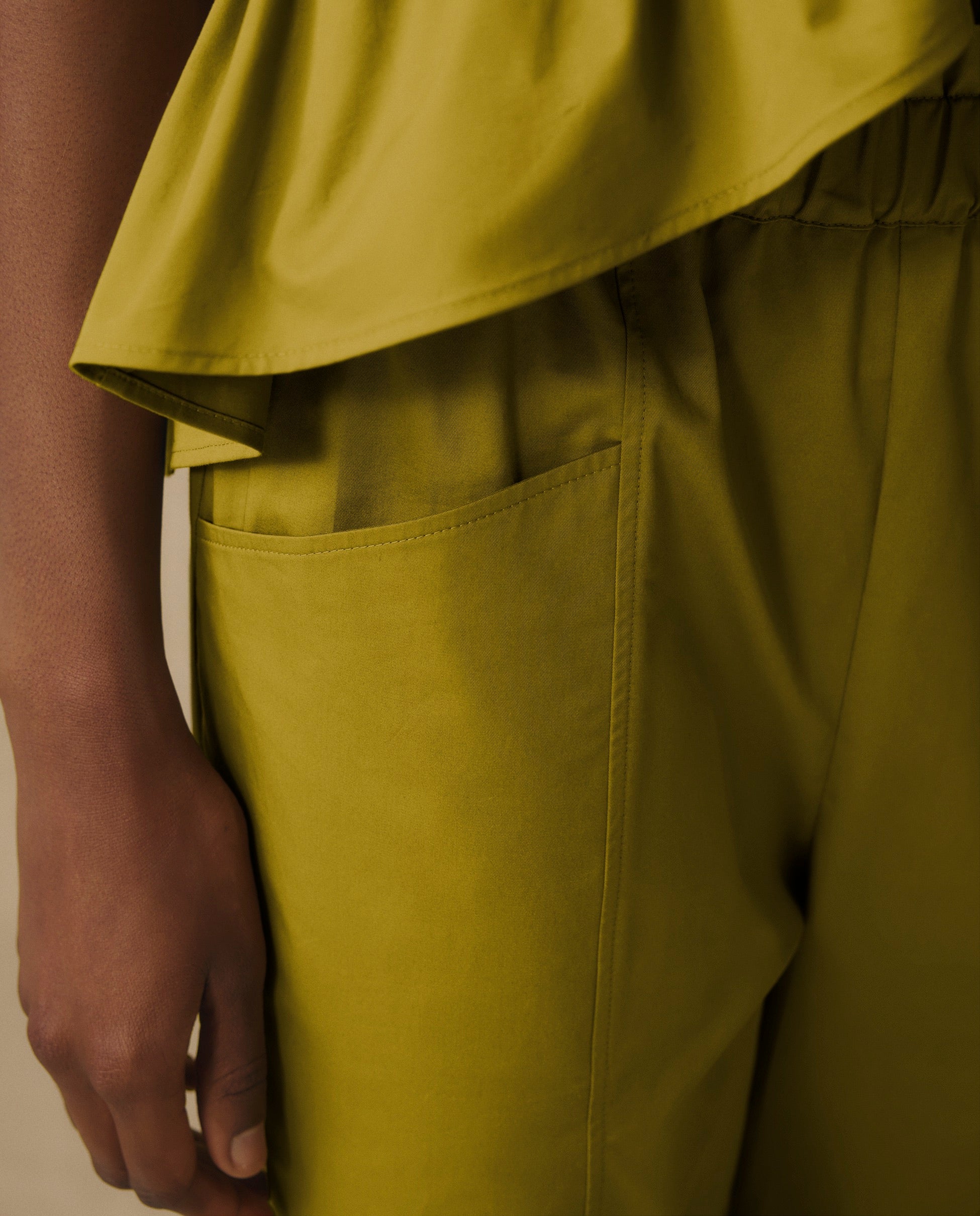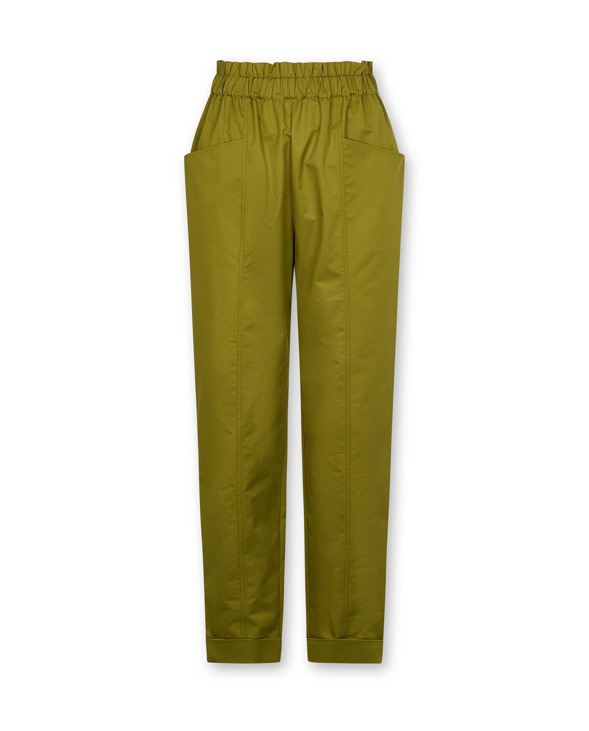 Renueva tu armario diario con el pantalón Astros en un suave tono verde oliva. Confeccionado en algodón firme con un sutil brillo, este diseño tapered combina color con una estructura relajada para reinterpretar el estilo casual con un toque refinado. La cintura elástica fruncida y los bolsillos delanteros extragrandes aportan un aire utilitario, mientras que las costuras limpias y el largo al tobillo completan un acabado depurado.