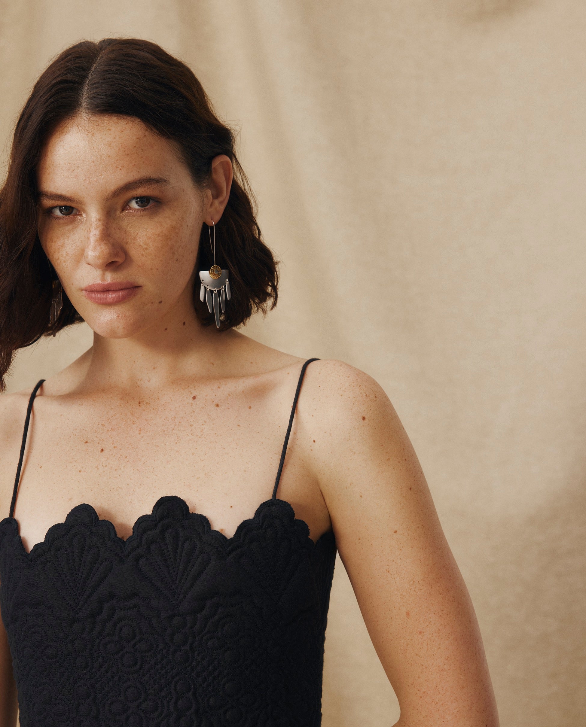 Los bordes festoneados y el bordado delicado aportan un aire romántico al top corto Ishani. Confeccionado en lino 100% , este diseño con tirantes es ideal para los días cálidos. Su silueta bohemia y femenina se ajusta suavemente al busto y se completa con una espalda elástica que ofrece comodidad y flexibilidad. Combínalo con el short o la chaqueta a juego para un look completo.