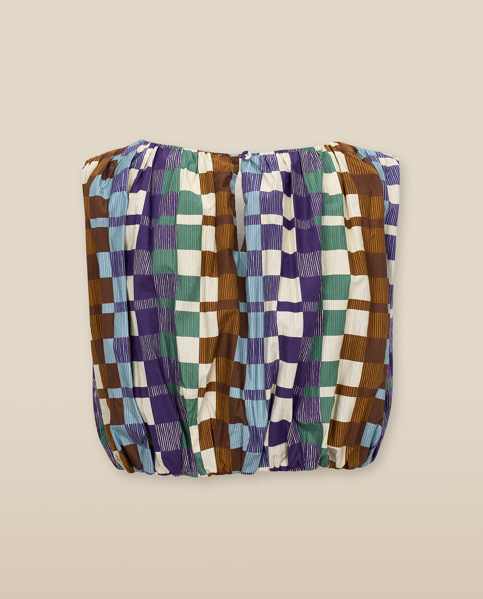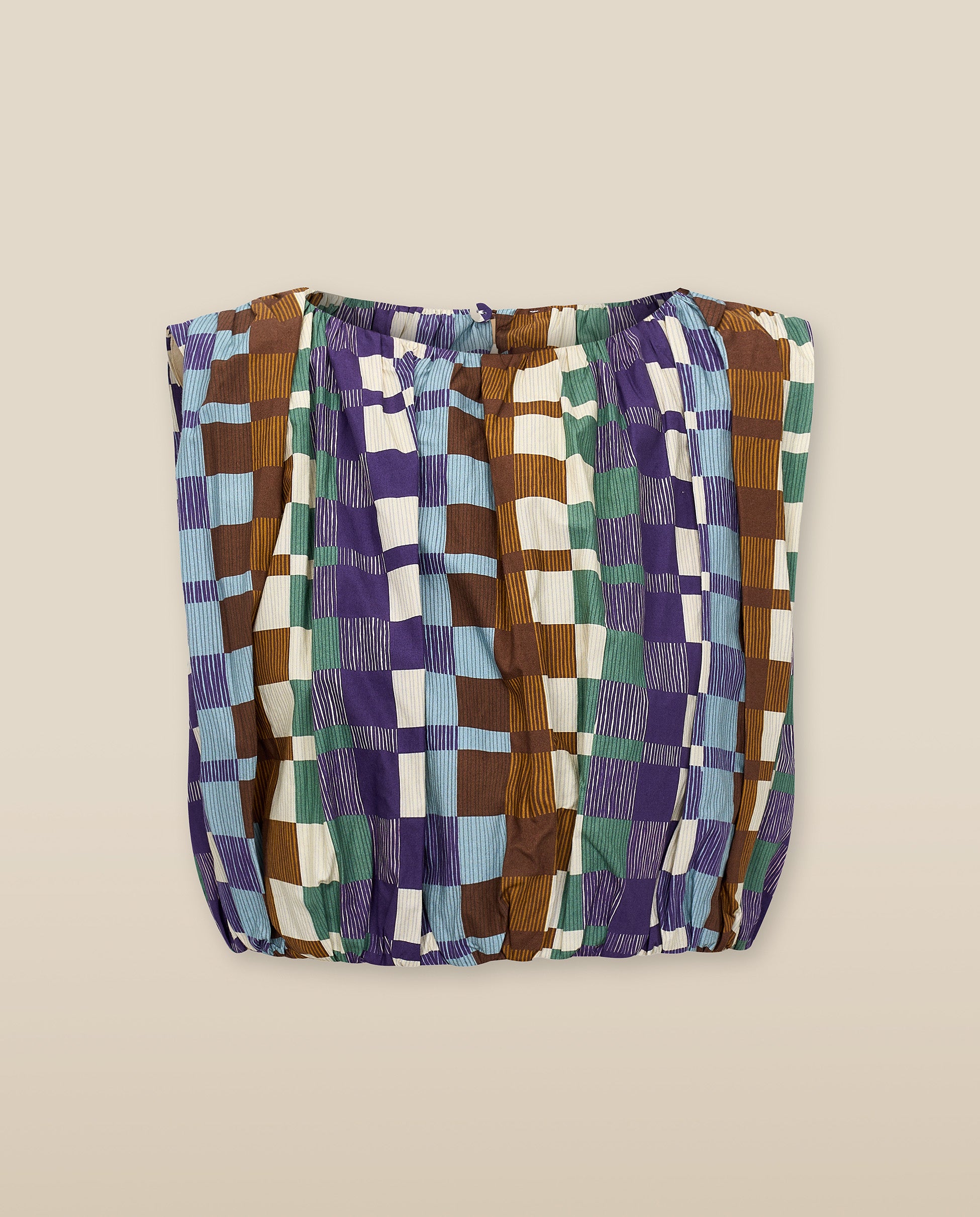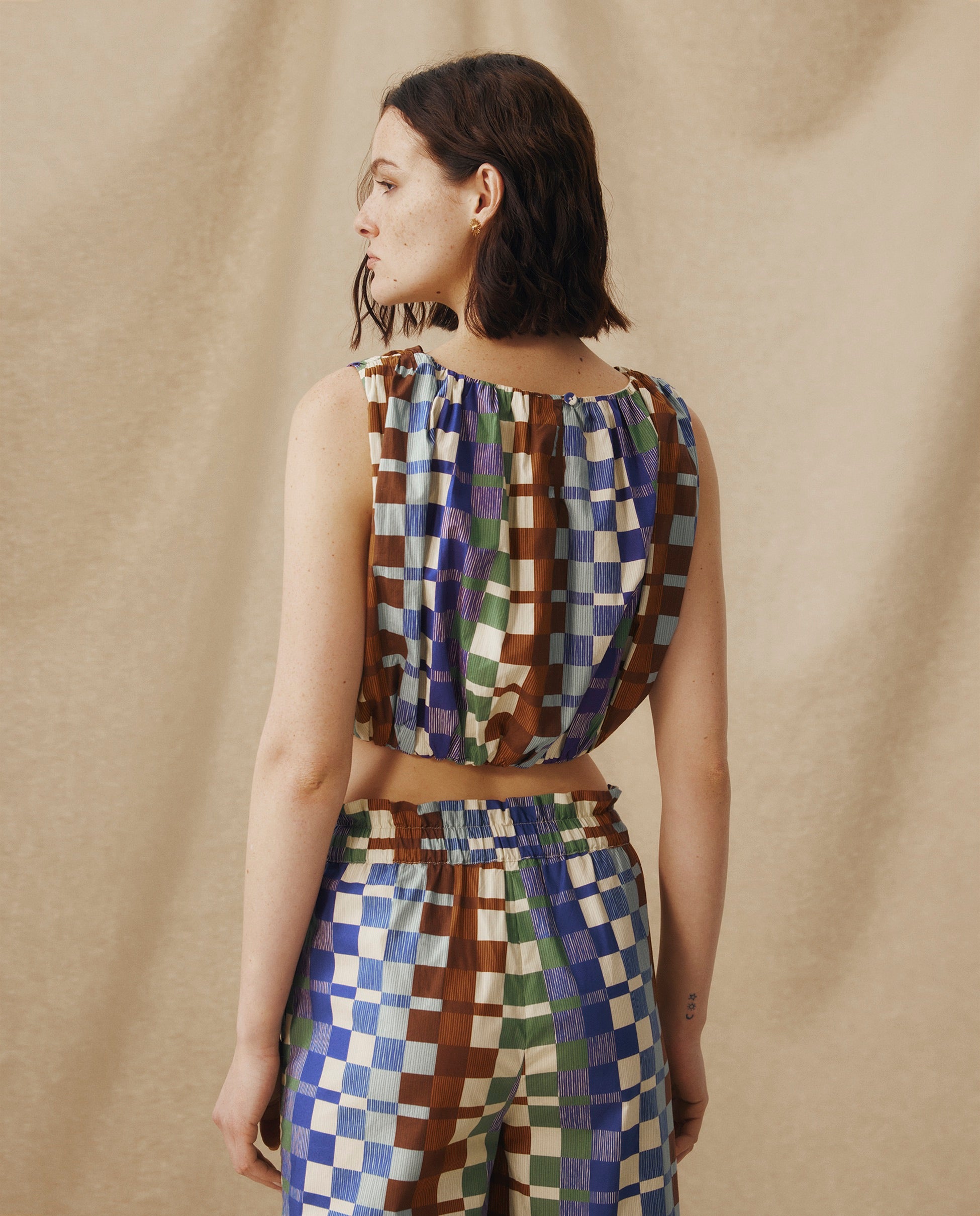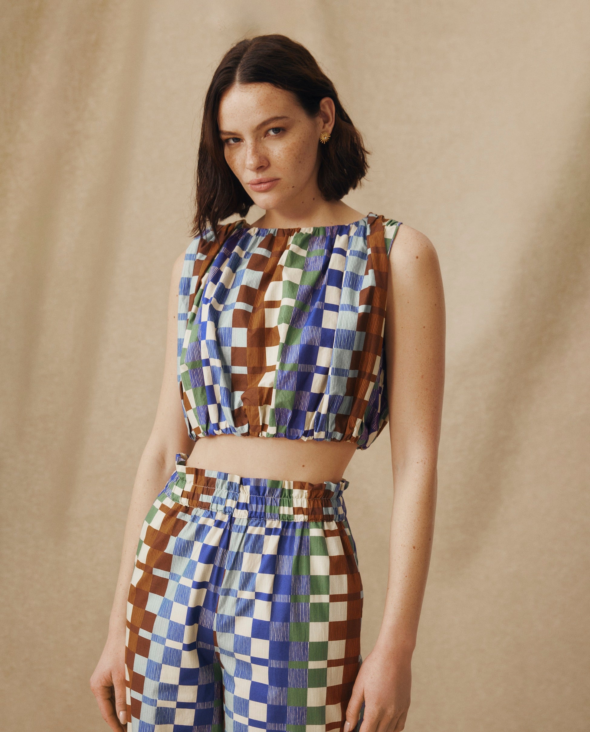 Una reinterpretación del boho, el top Morinal destaca por su silueta con volumen y su estampado geométrico en tonos llamativos. Confeccionado en algodón 100%, presenta un escote fruncido, bajo cropped con borde elástico y acabados flexibles para un ajuste cómodo. Llévalo con el pantalón a juego para un conjunto impactante o solo para un look más desenfadado.