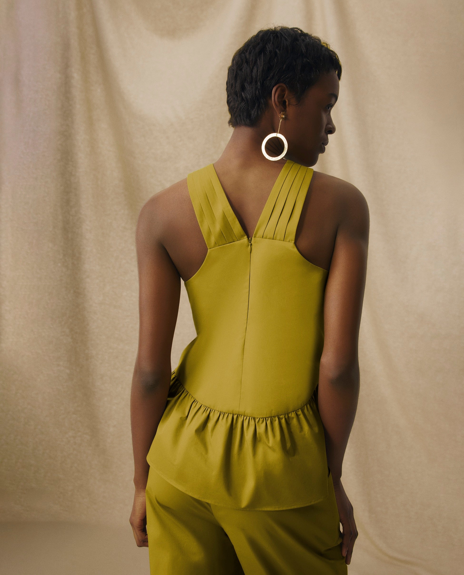 Original y sutil, el top Popea en verde oliva se caracteriza por su silueta artística y su llamativo volante. Confeccionado en algodón con elastano, se cruza sobre el cuerpo con un escote halter y un bajo asimétrico. Los frunces aportan fluidez, mientras que la cremallera oculta en la espalda asegura un acabado limpio y sofisticado.