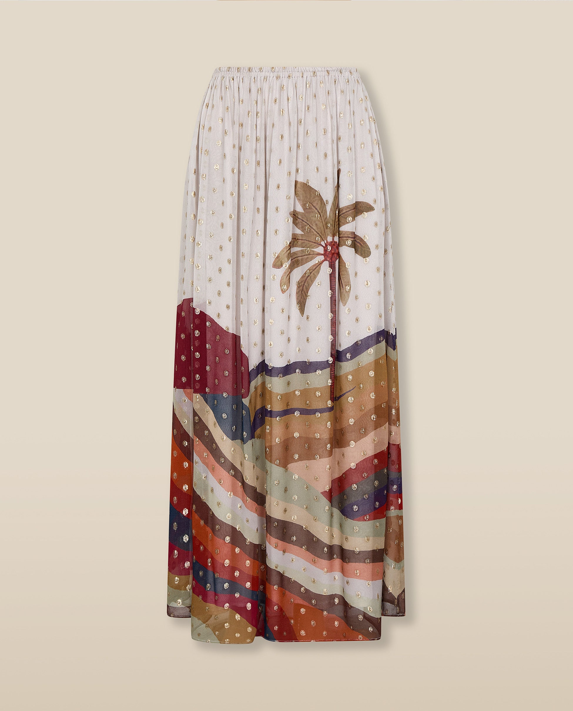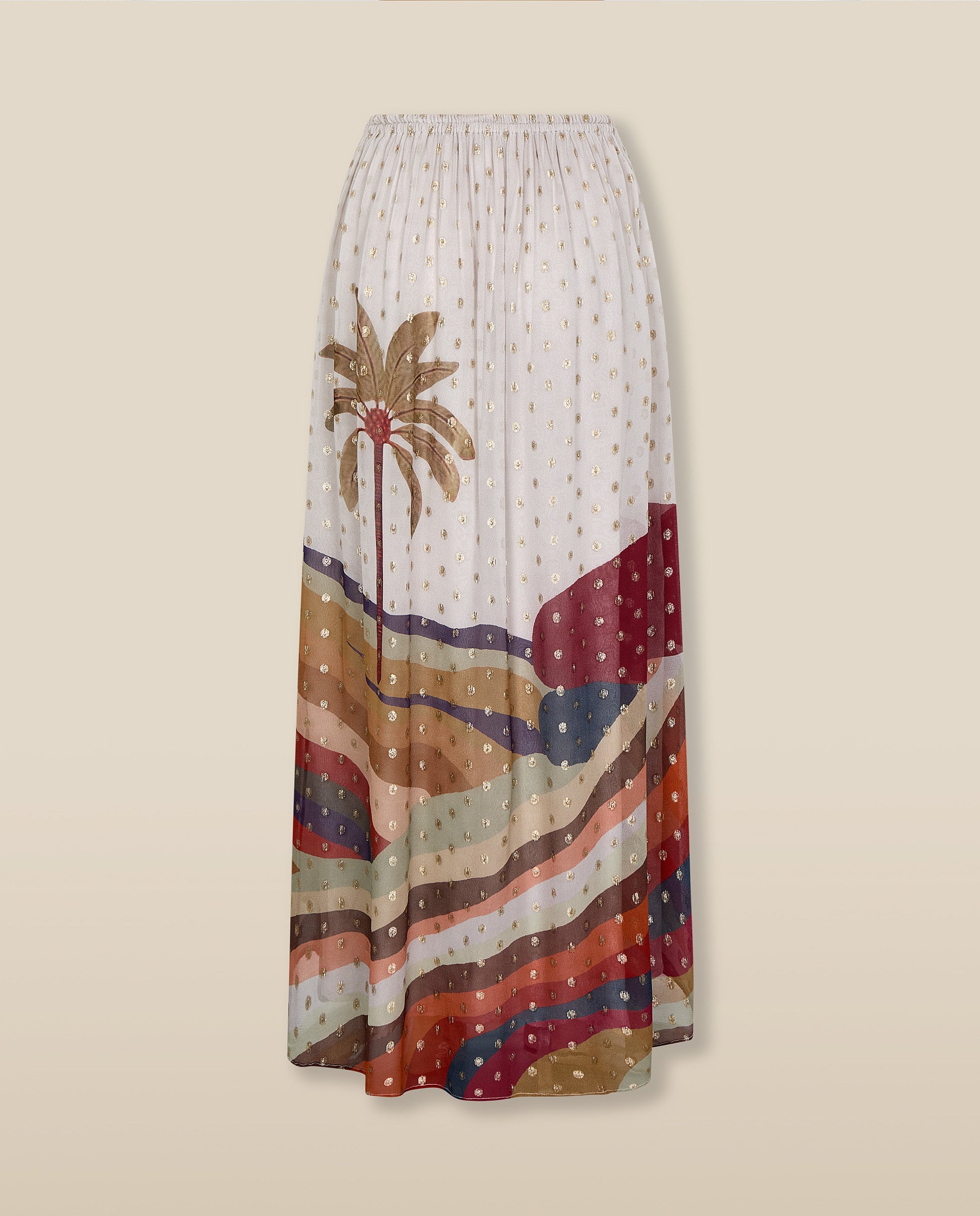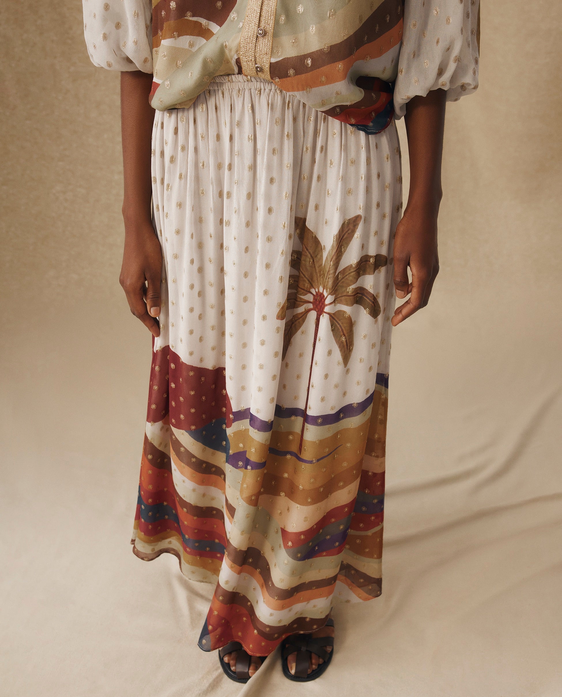 Con un estampado inspirado en el desierto, la falda Vedha combina elegancia y estilo atemporal. De silueta fluida, está bordada con lunares metalizados que captan la luz y cuenta con cintura alta elástica para un ajuste cómodo y favorecedor. Combínala con la blusa a juego para lucir un conjunto que no pasa desapercibido.