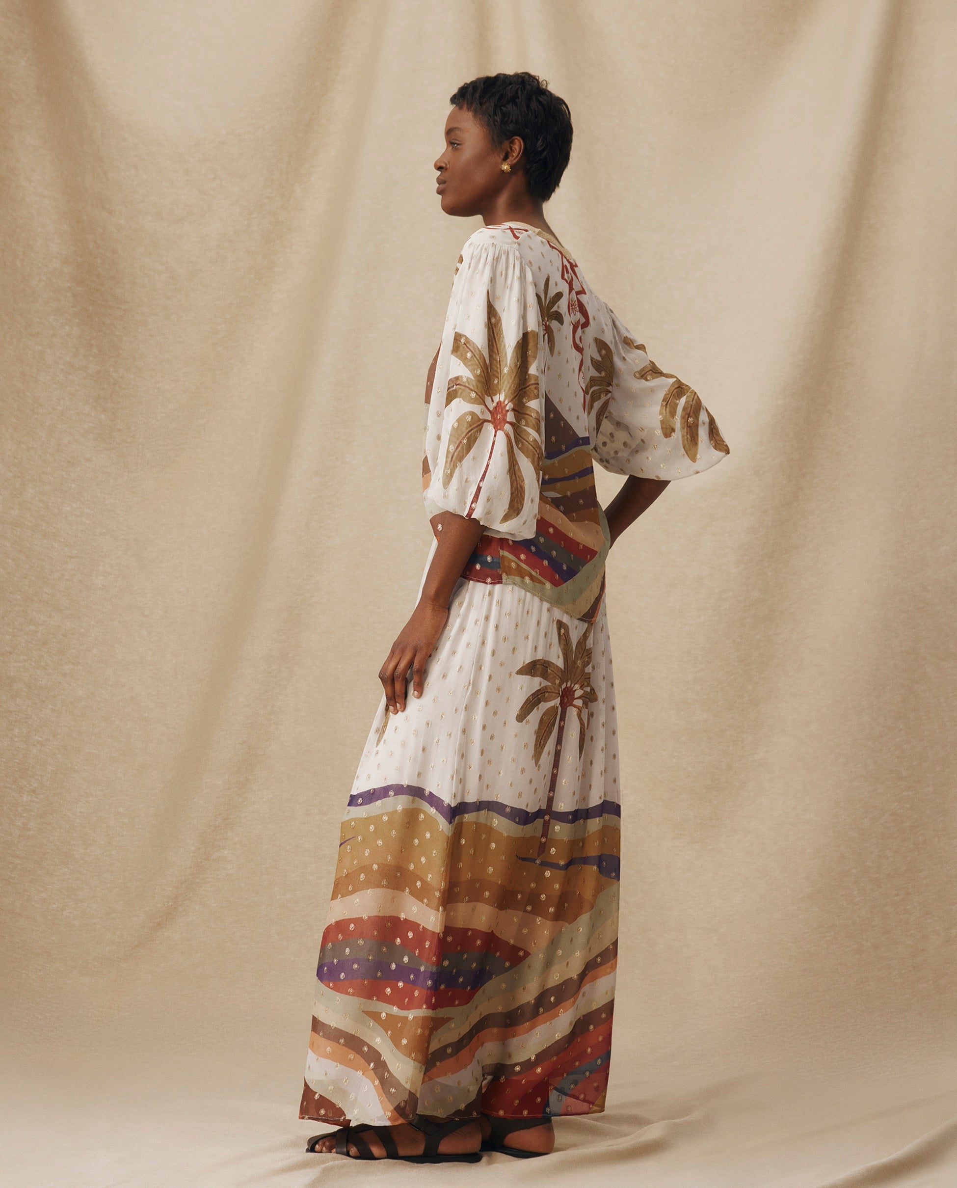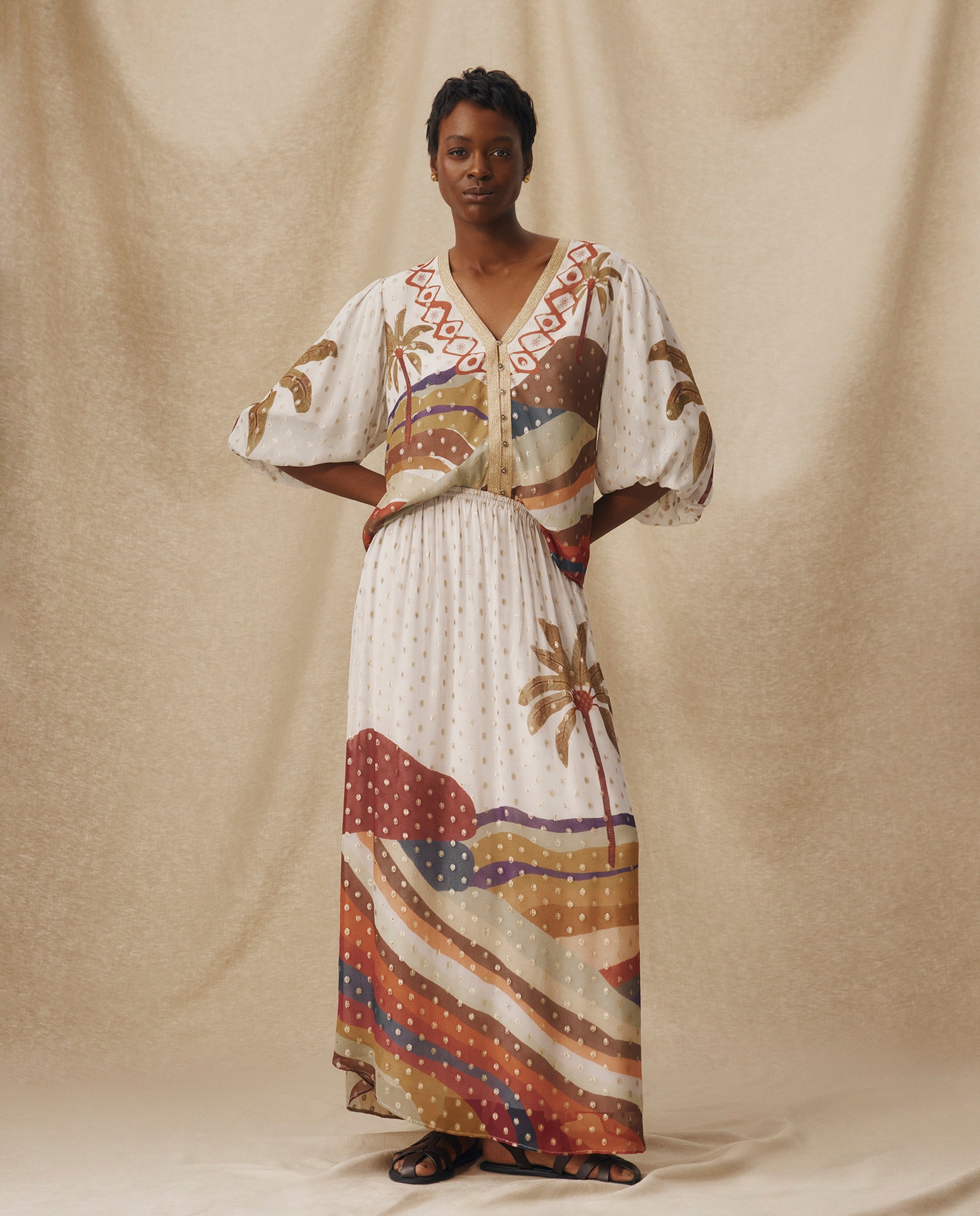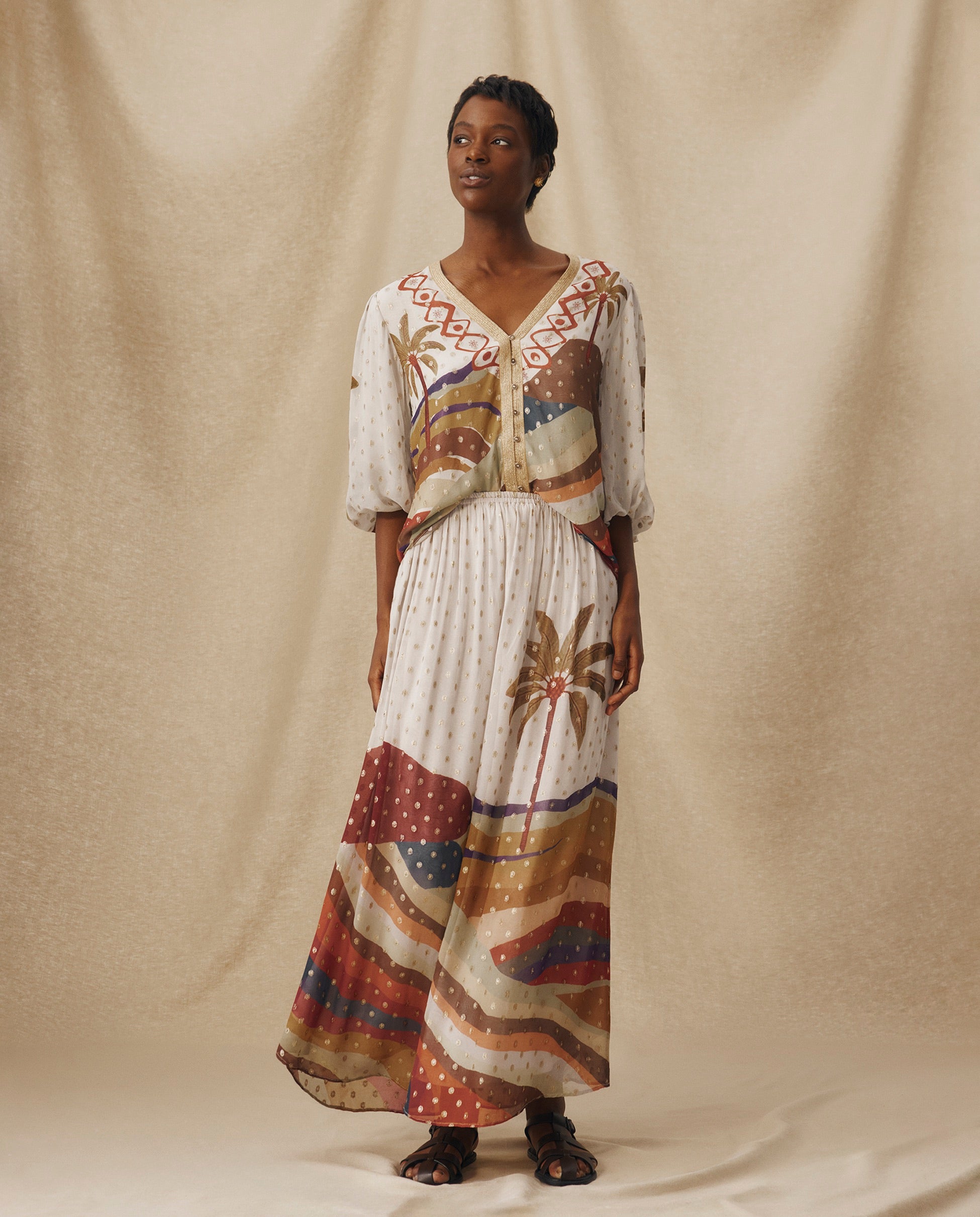 Con un estampado inspirado en el desierto, la falda Vedha combina elegancia y estilo atemporal. De silueta fluida, está bordada con lunares metalizados que captan la luz y cuenta con cintura alta elástica para un ajuste cómodo y favorecedor. Combínala con la blusa a juego para lucir un conjunto que no pasa desapercibido.