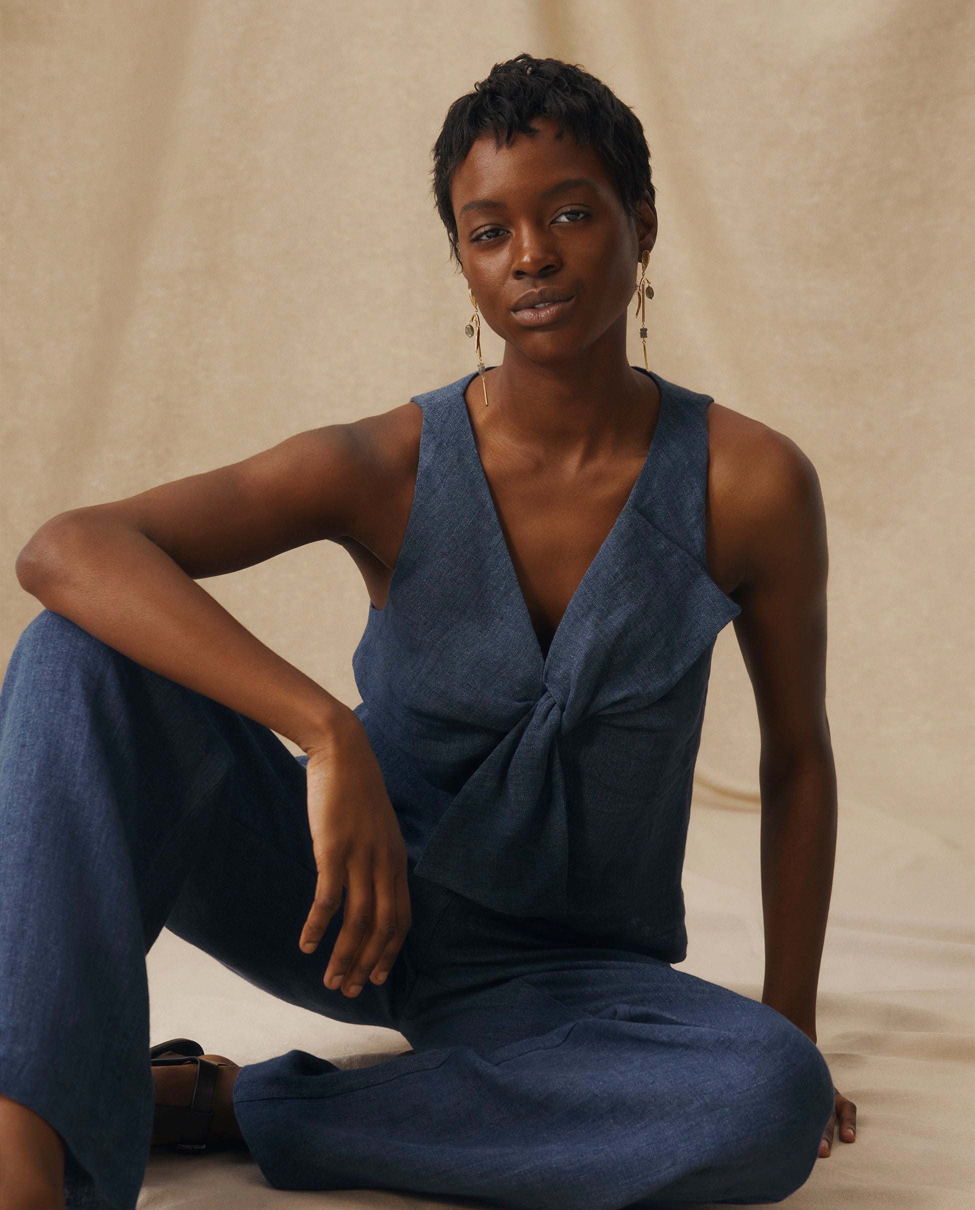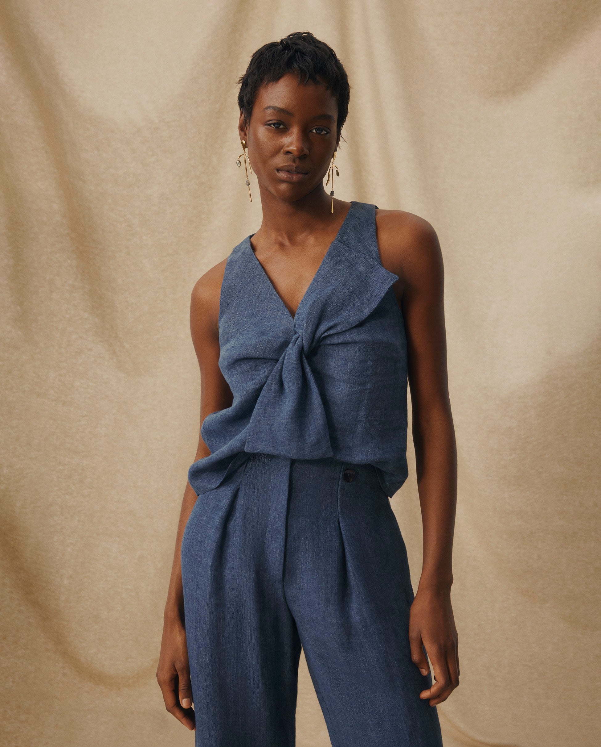 Confeccionado en lino italiano 100%, el top Zuri destaca por su lazo frontal escultural y una silueta sin mangas de líneas limpias. Su estructura marcada y escote en pico profundo aportan un toque sofisticado ideal para los días cálidos. Combínalo con el pantalón a juego para un look coordinado con facilidad.