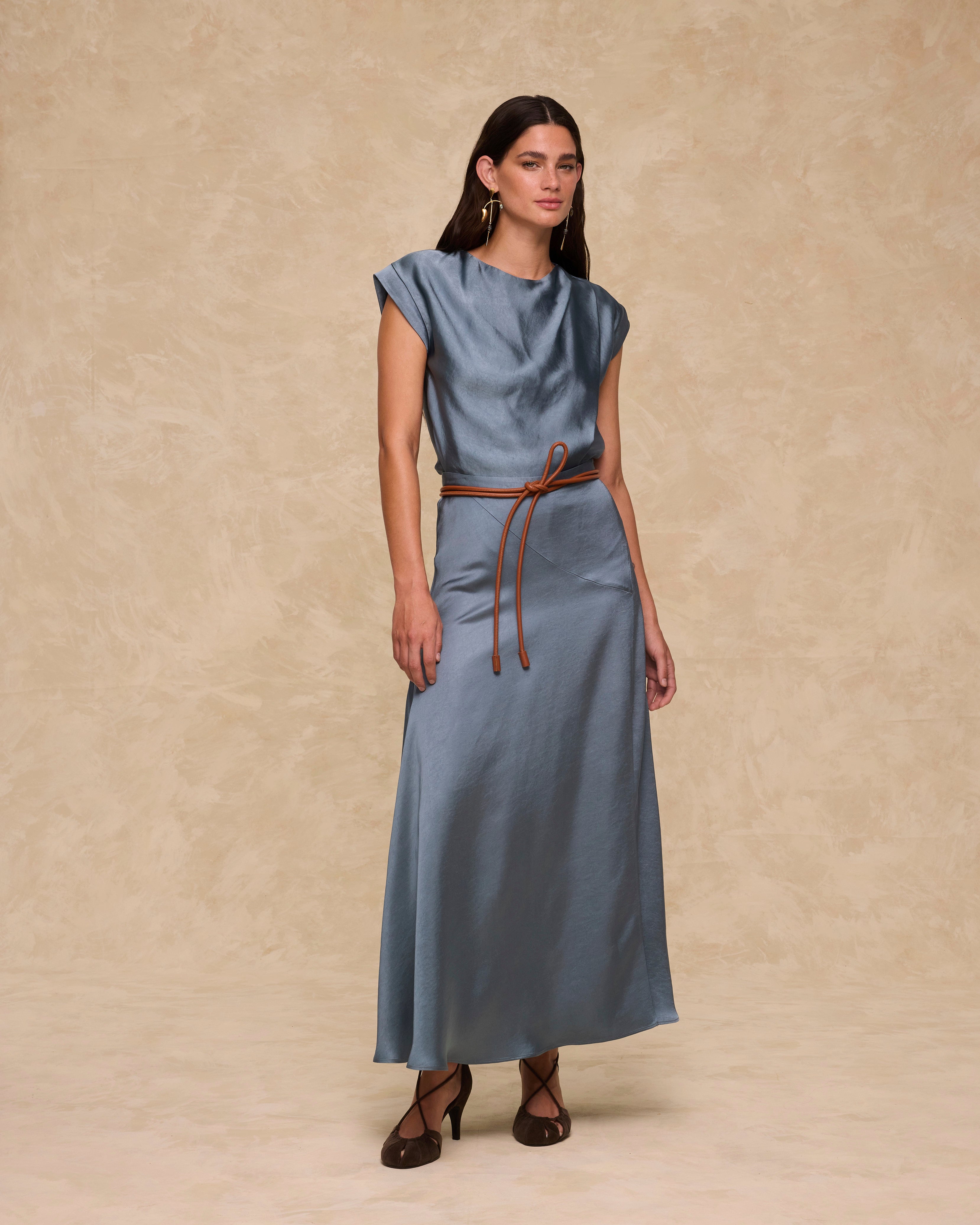 El top Natalia es una prenda esencial y sofisticada en tono acero. Diseñado con mangas cortas tipo capa y frunces suaves en los hombros, presenta un escote redondo limpio y se abrocha en la parte posterior con dos botones al tono.