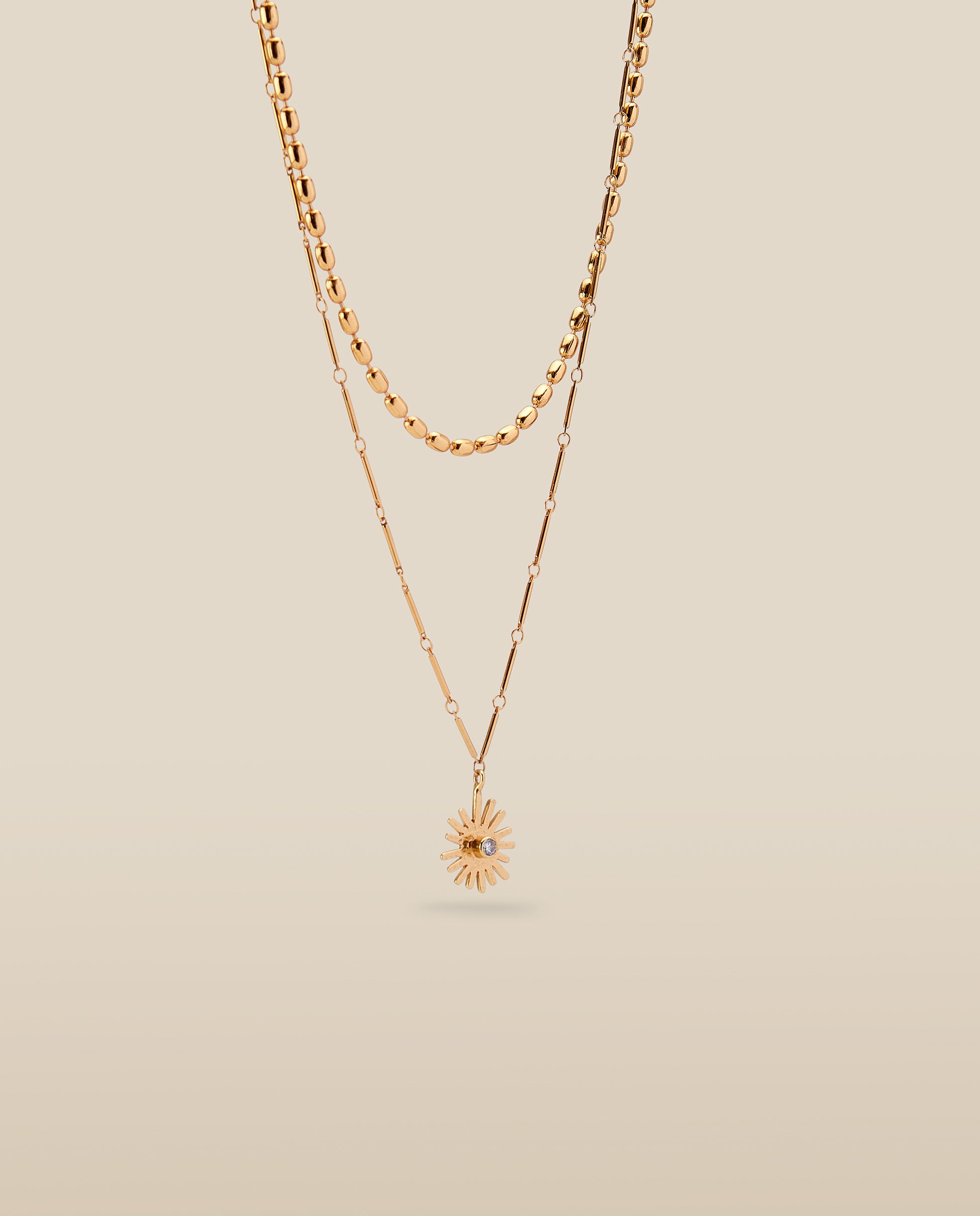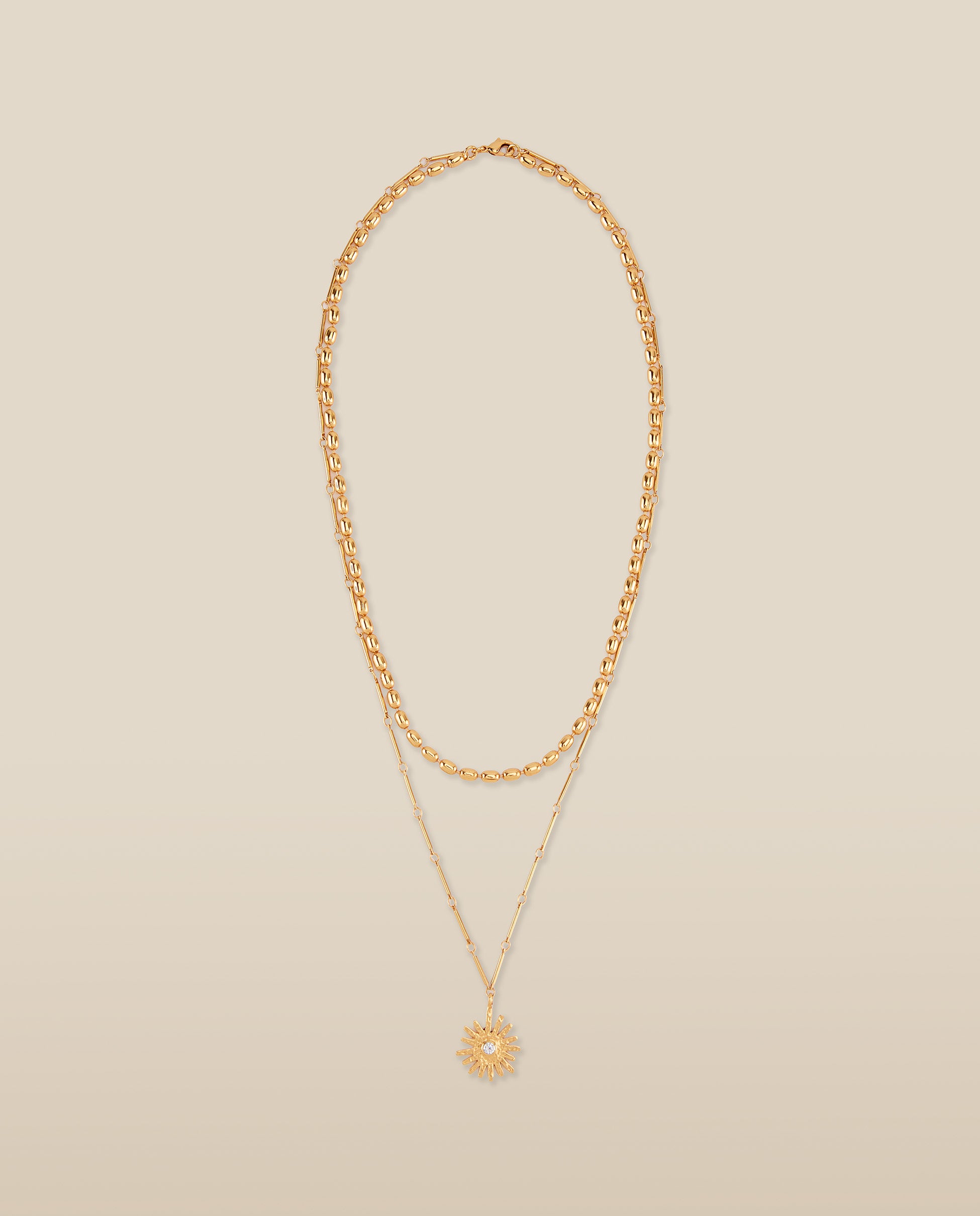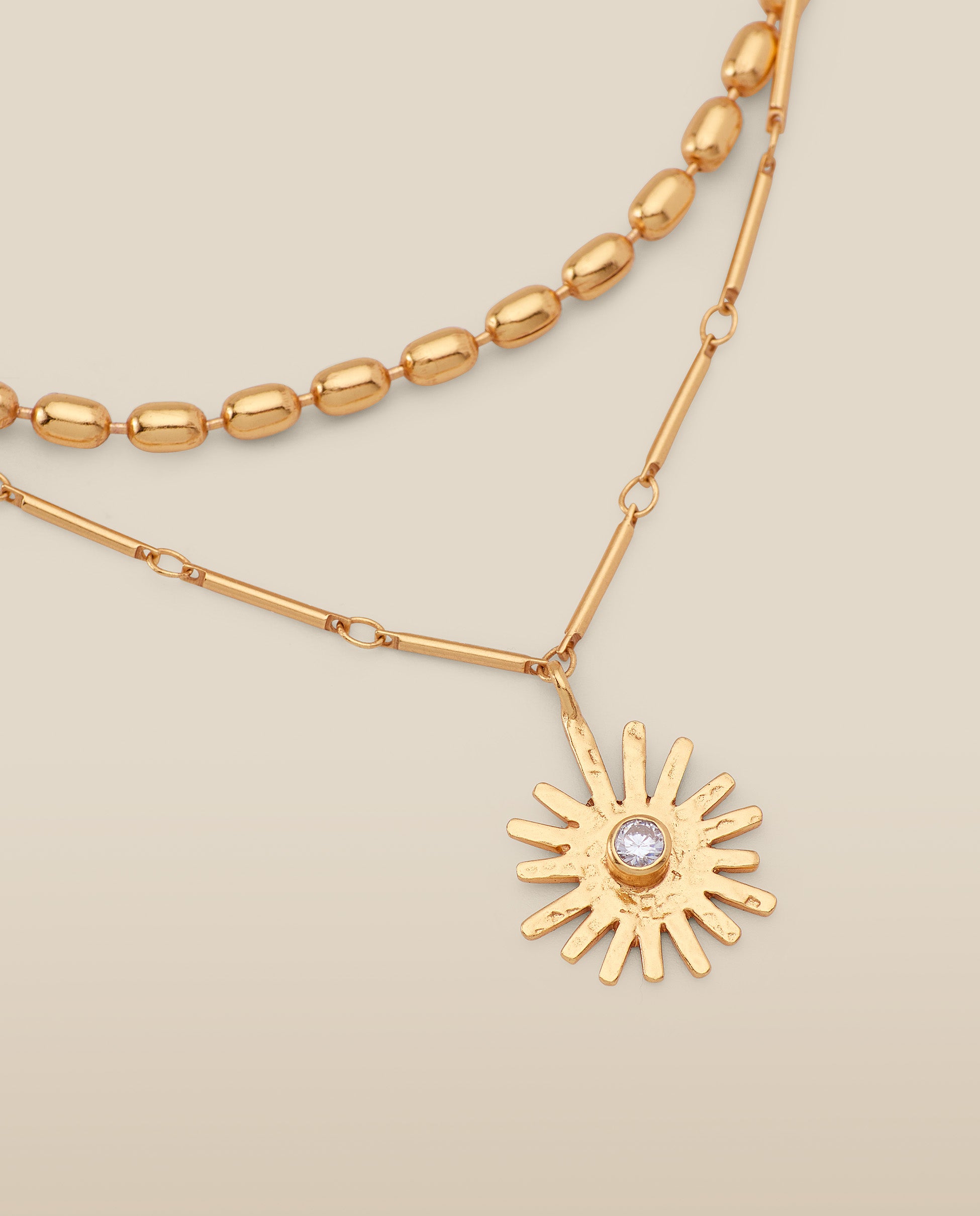 Confeccionado en metal chapado en oro de 22 quilates, el collar Sunny presenta un diseño de doble cadena. La más larga, una cadena fina con un colgante en forma de sol decorado con circonita blanca. La cadena más corta con cuentas ovaladas. Tiene un cierre de mosquetón seguro para un ajuste cómodo.