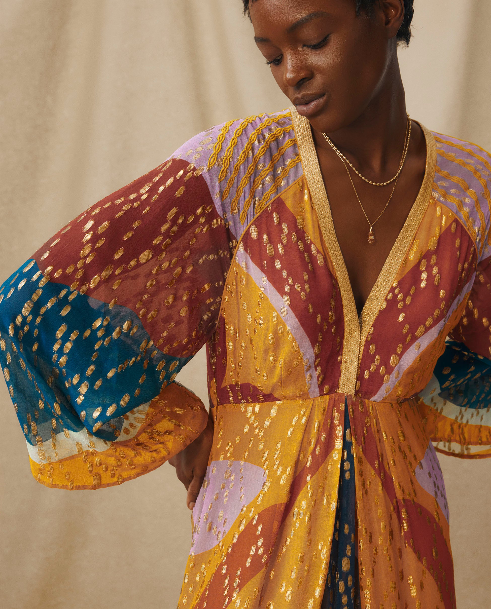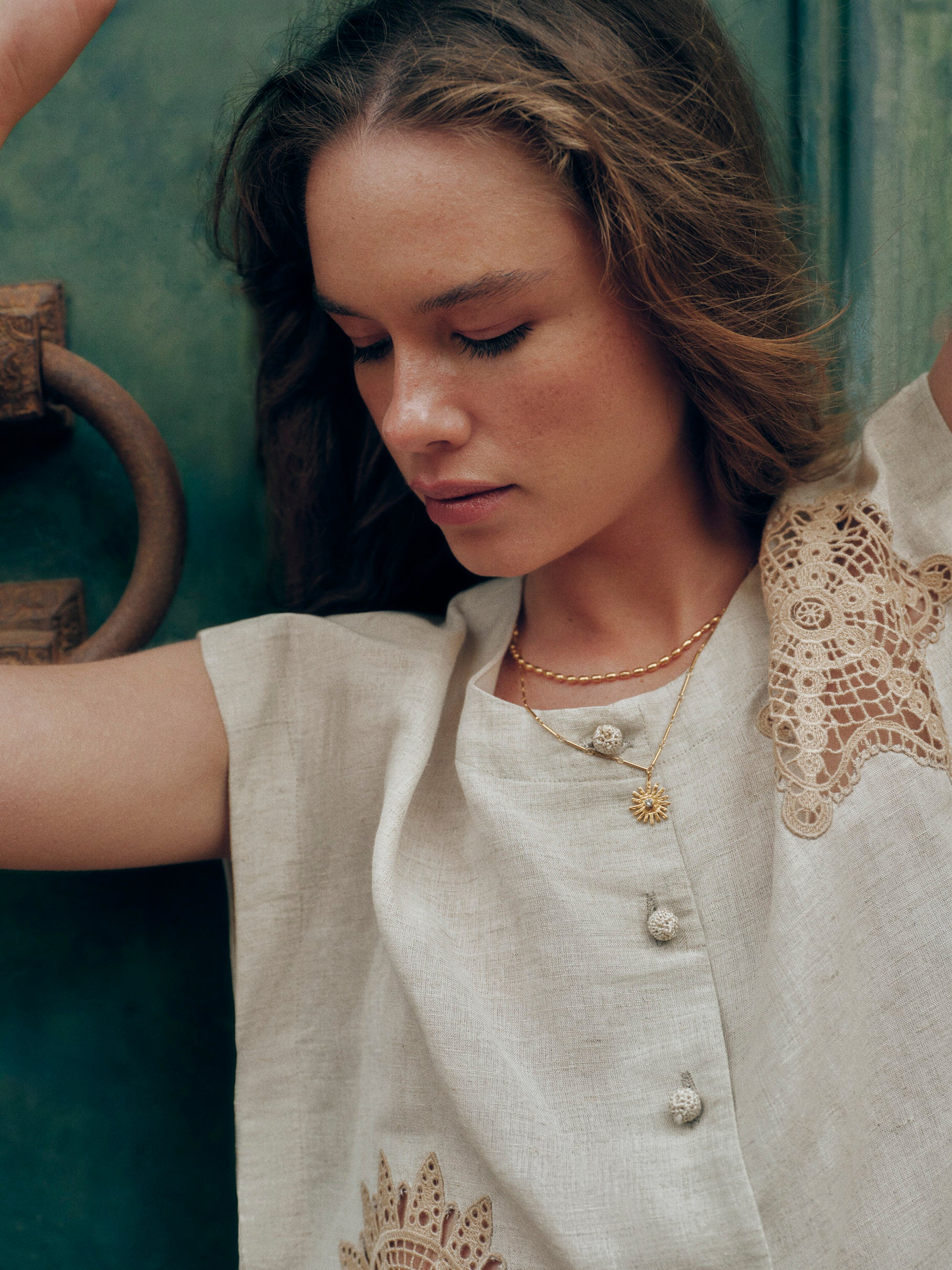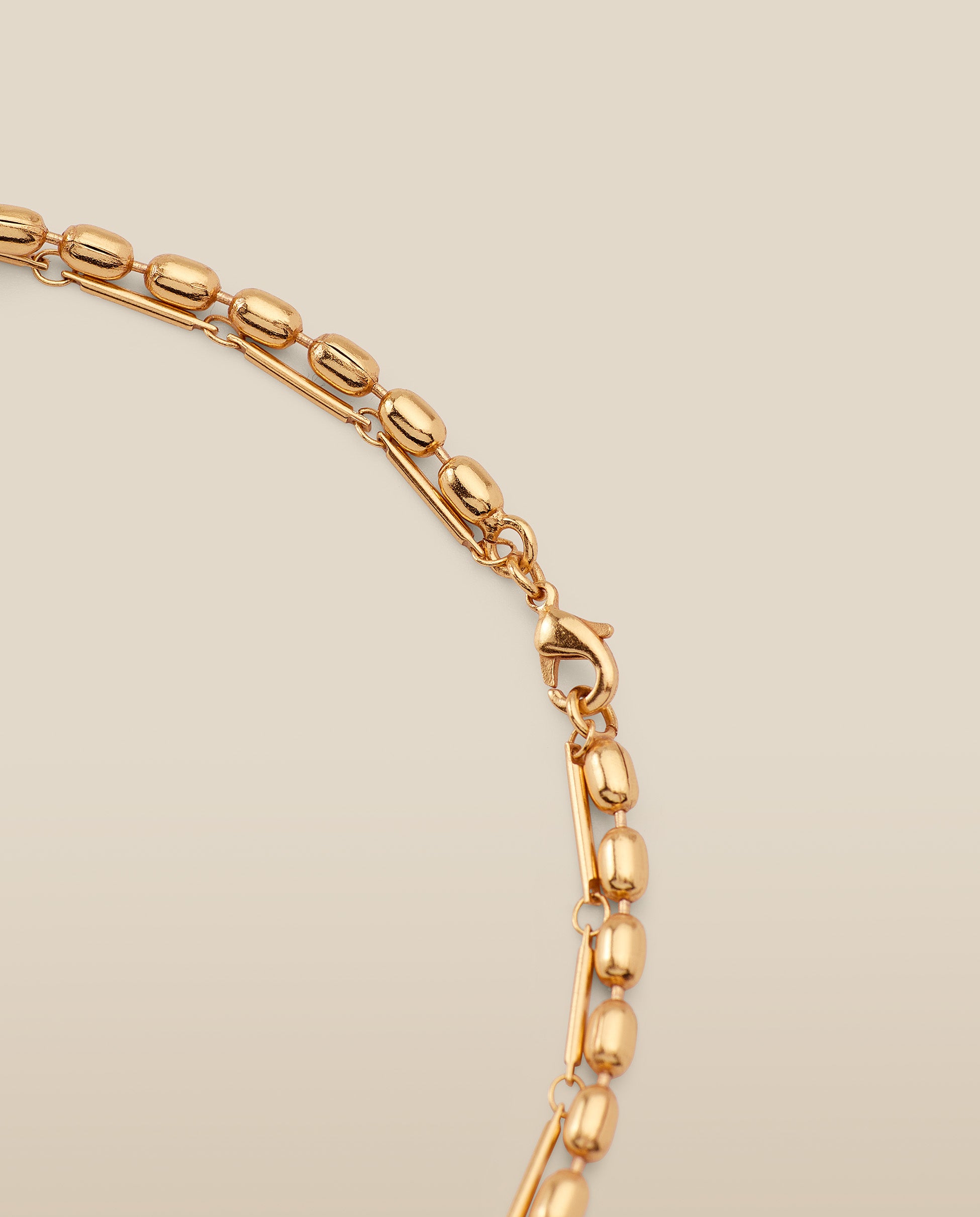 Confeccionado en metal chapado en oro de 22 quilates, el collar Sunny presenta un diseño de doble cadena. La más larga, una cadena fina con un colgante en forma de sol decorado con circonita blanca. La cadena más corta con cuentas ovaladas. Tiene un cierre de mosquetón seguro para un ajuste cómodo.